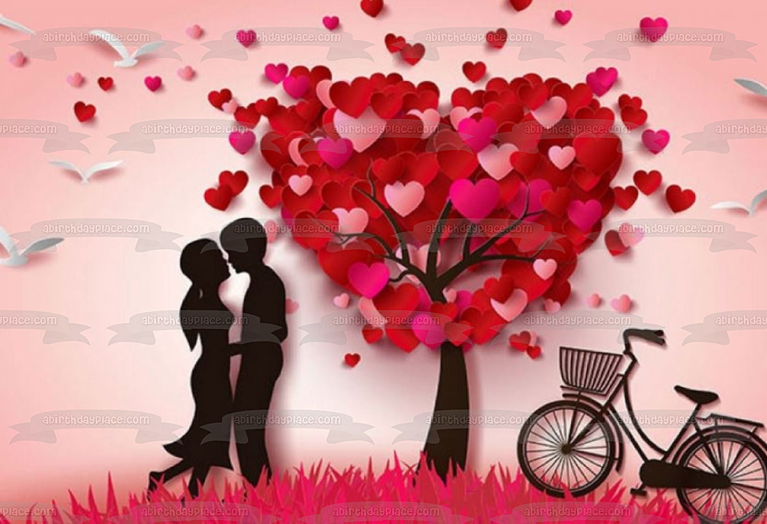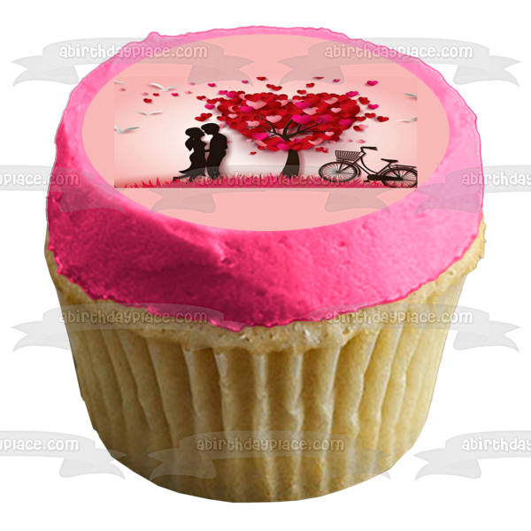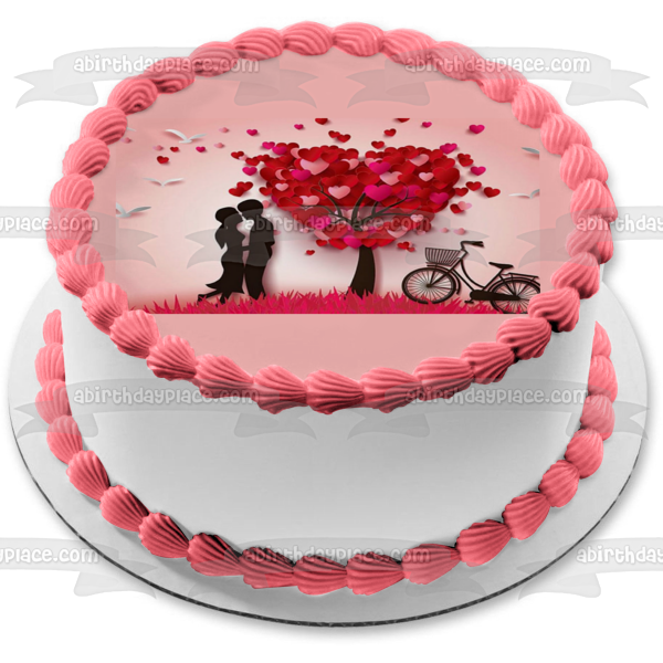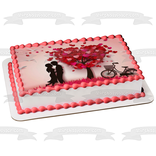 Decorate your Cake with this Happy Valentines Day themed Edible Cake Topper Image featuring a Tree full of Hearts and Silhouettes of a Man and Woman Embracing!