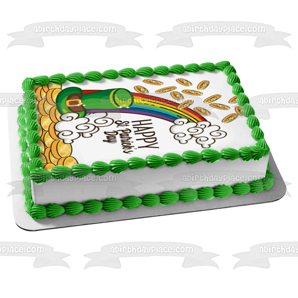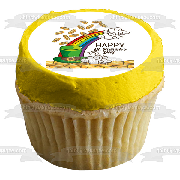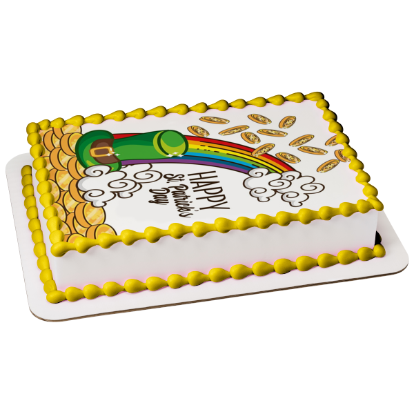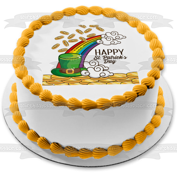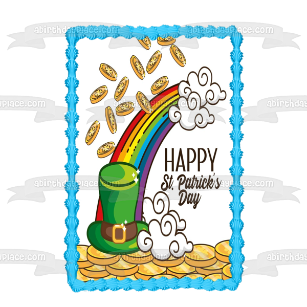 Decorate your Cake with this Happy St. Patrick's Day themed Edible Cake Topper Image featuring a Rainbow Leprechaun Hat and Gold Coins!