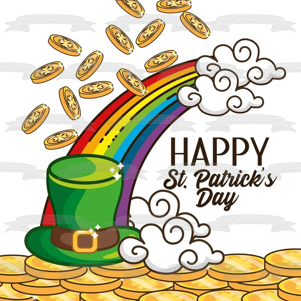 Happy St. Patrick's Day Rainbow Leprechaun Hat Gold Coins Edible Cake Topper Image ABPID55251