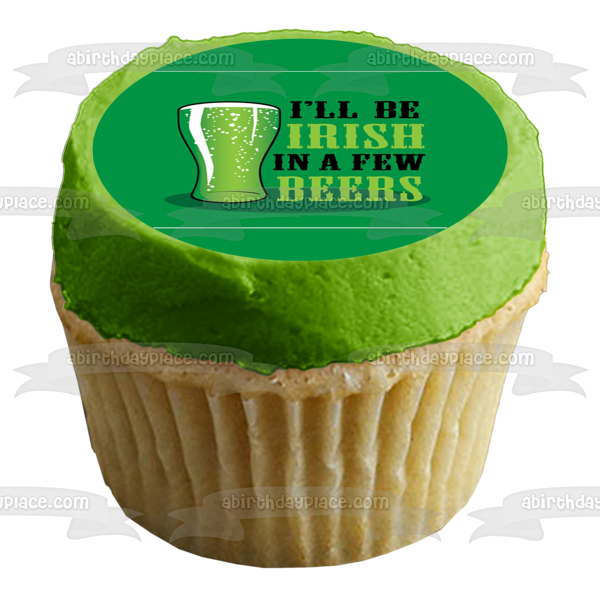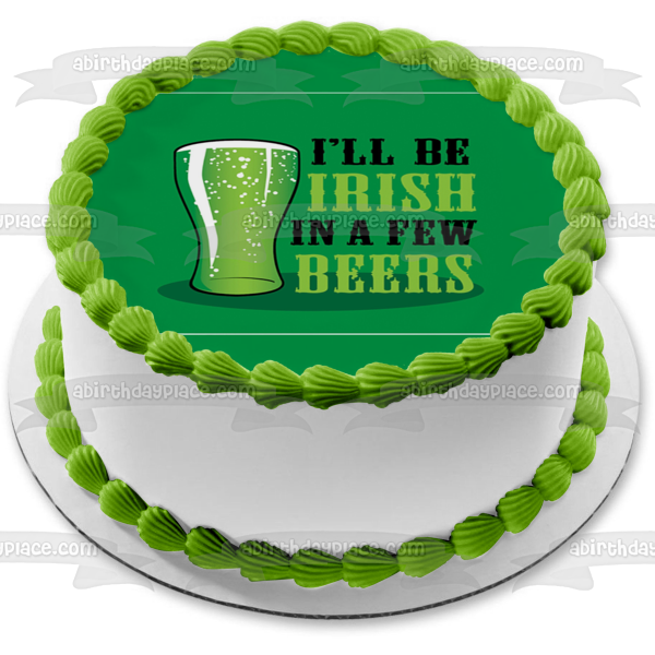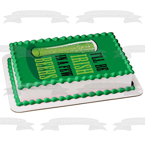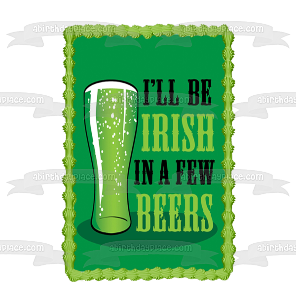 Decorate your Cake with this Happy St. Patrick's Day themed Edible Cake Topper Image featuring the words "I'll Be Irish in a Few Beers" and a glass of Beer!
