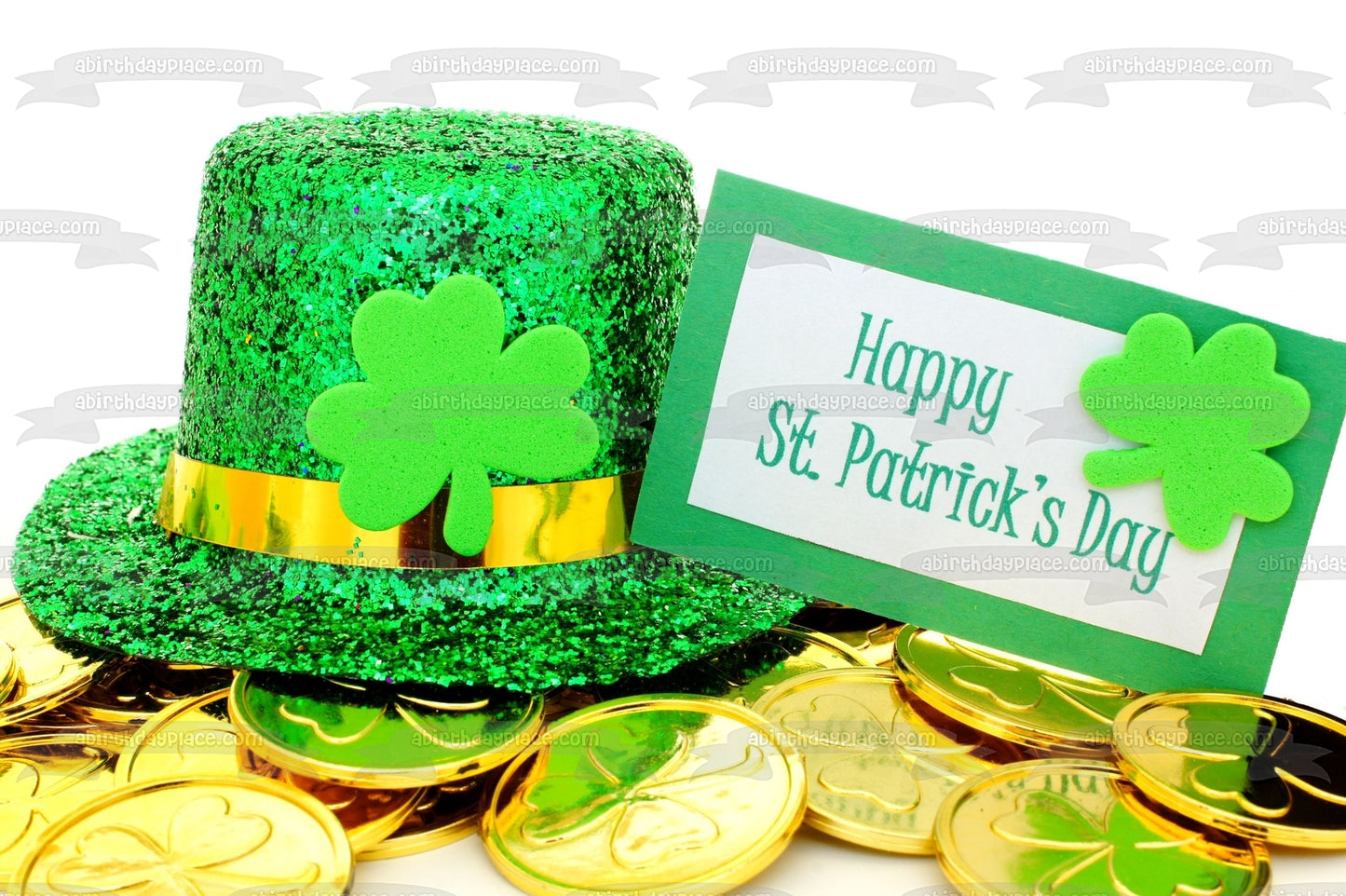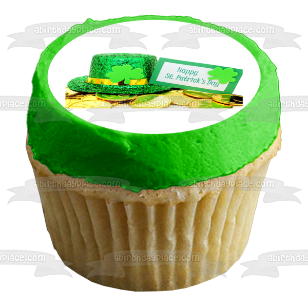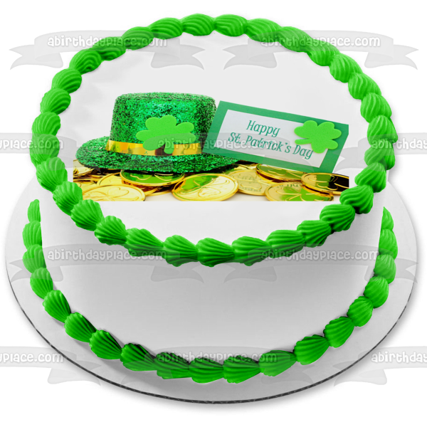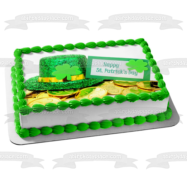 Decorate your Cake with this Happy St. Patrick's Day themed Edible Cake Topper Image featuring a Leprechaun Hat, Shamrocks and Gold Coins!