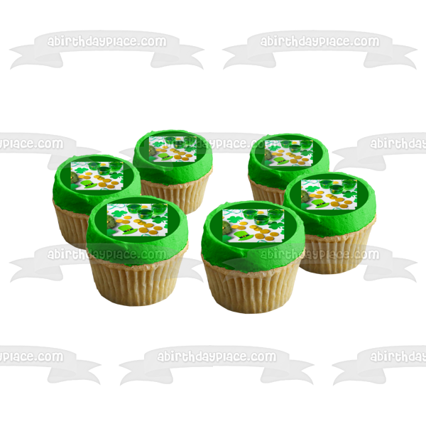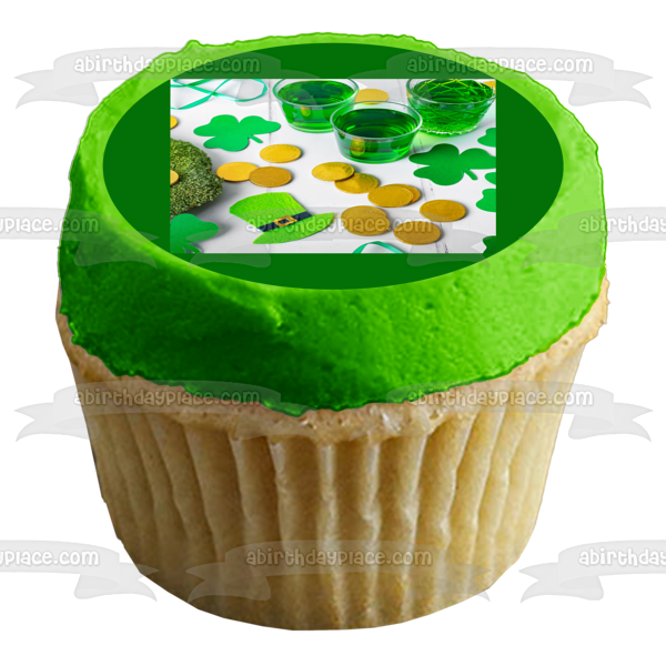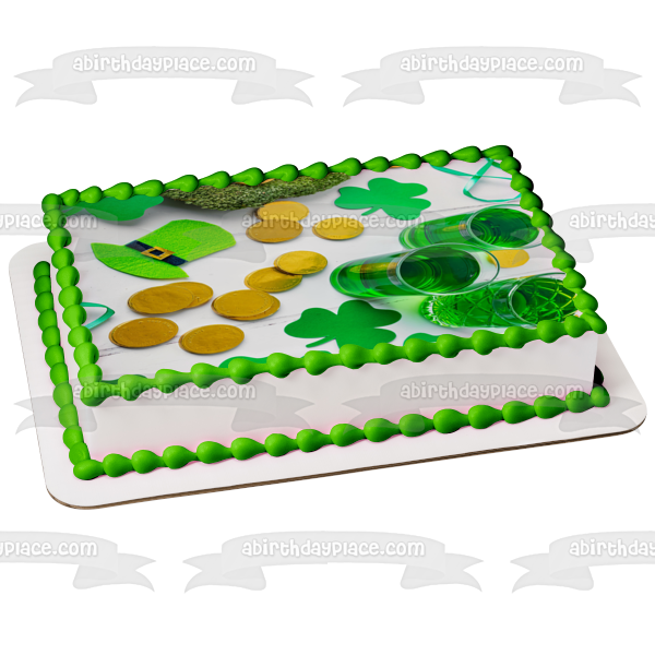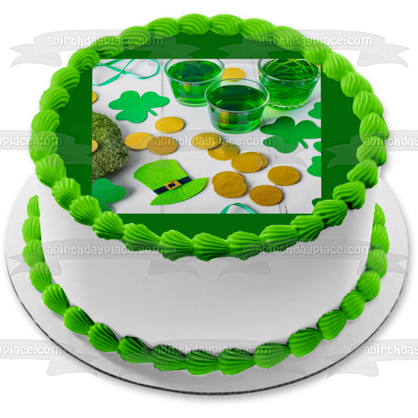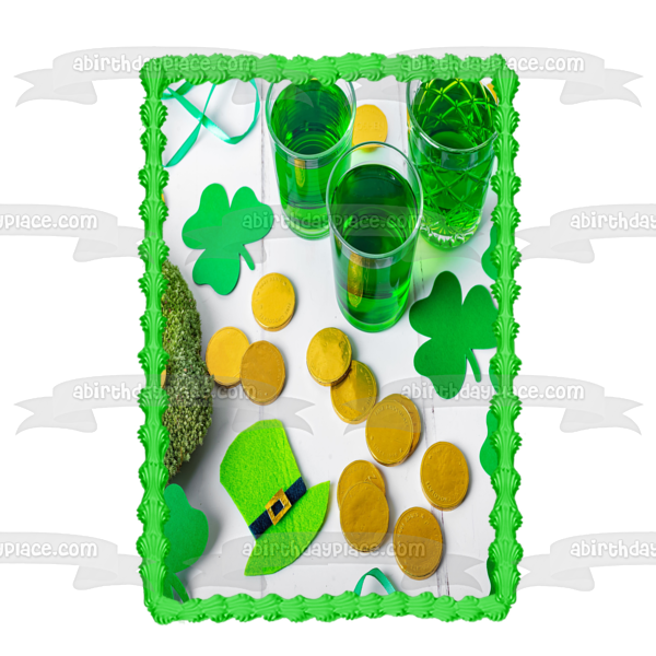 Decorate your Cake with this Happy St. Patrick's Day themed Edible Cake Topper Image featuring Gold Coins, Leprechaun Hats and Shamrocks!