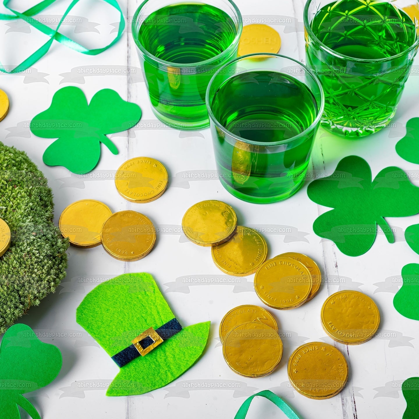 Happy St. Patrick's Day Gold Coins Leprechaun Hats Shamrocks Edible Cake Topper Image ABPID55261