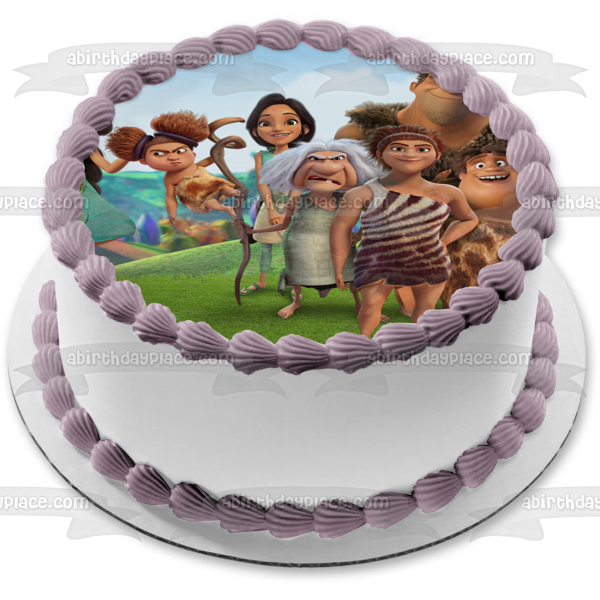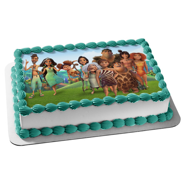 Decorate your Cake with this The Croods: Family Tree themed Edible Cake Topper Image featuring Guy, Eep, Hope, Gran, Phil and Dawn!