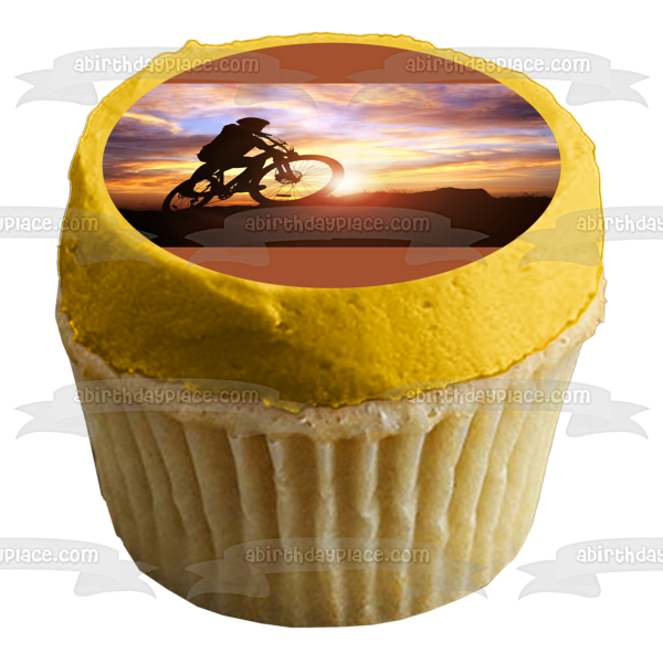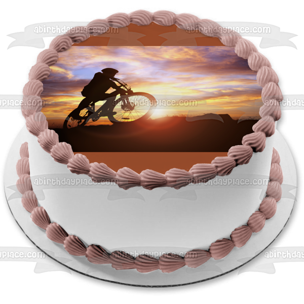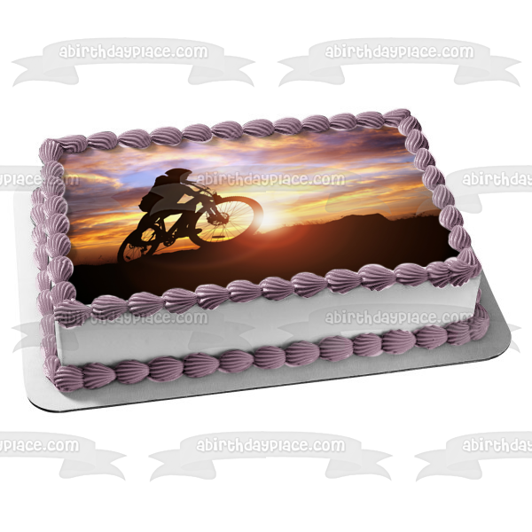 Decorate your Cake with this Mountain Biking themed Edible Cake Topper Image featuring a Bike at Sunset Silhouette!
