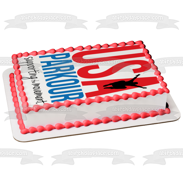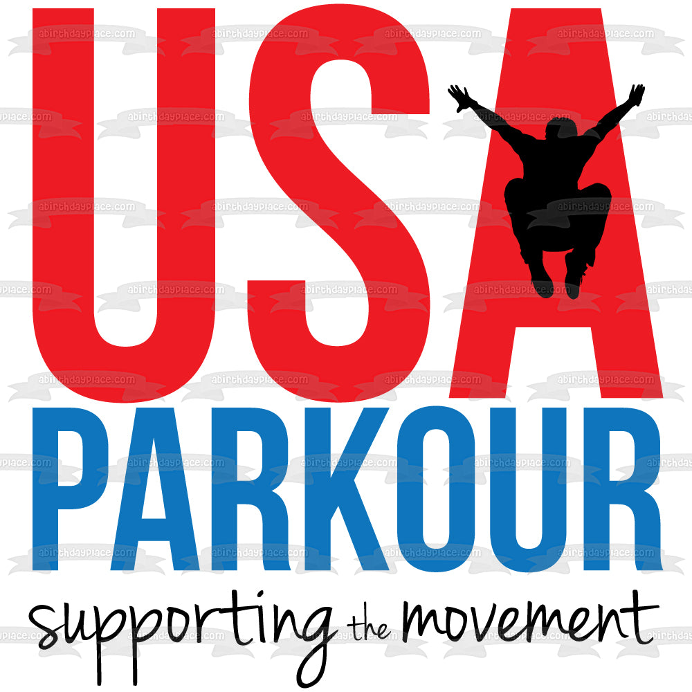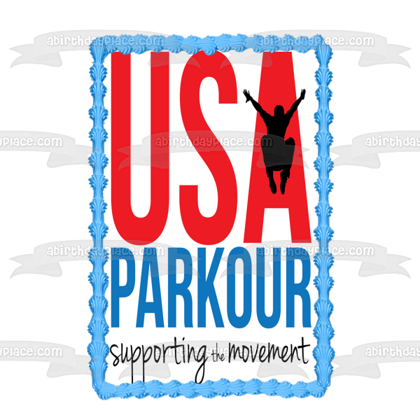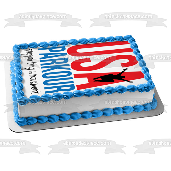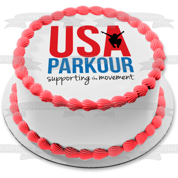 Decorate your Cake with this USA Parkour themed Edible Cake Topper Image featuring the Premier Parkour Insurance Supporting the Movement Logo!