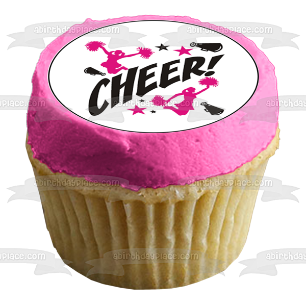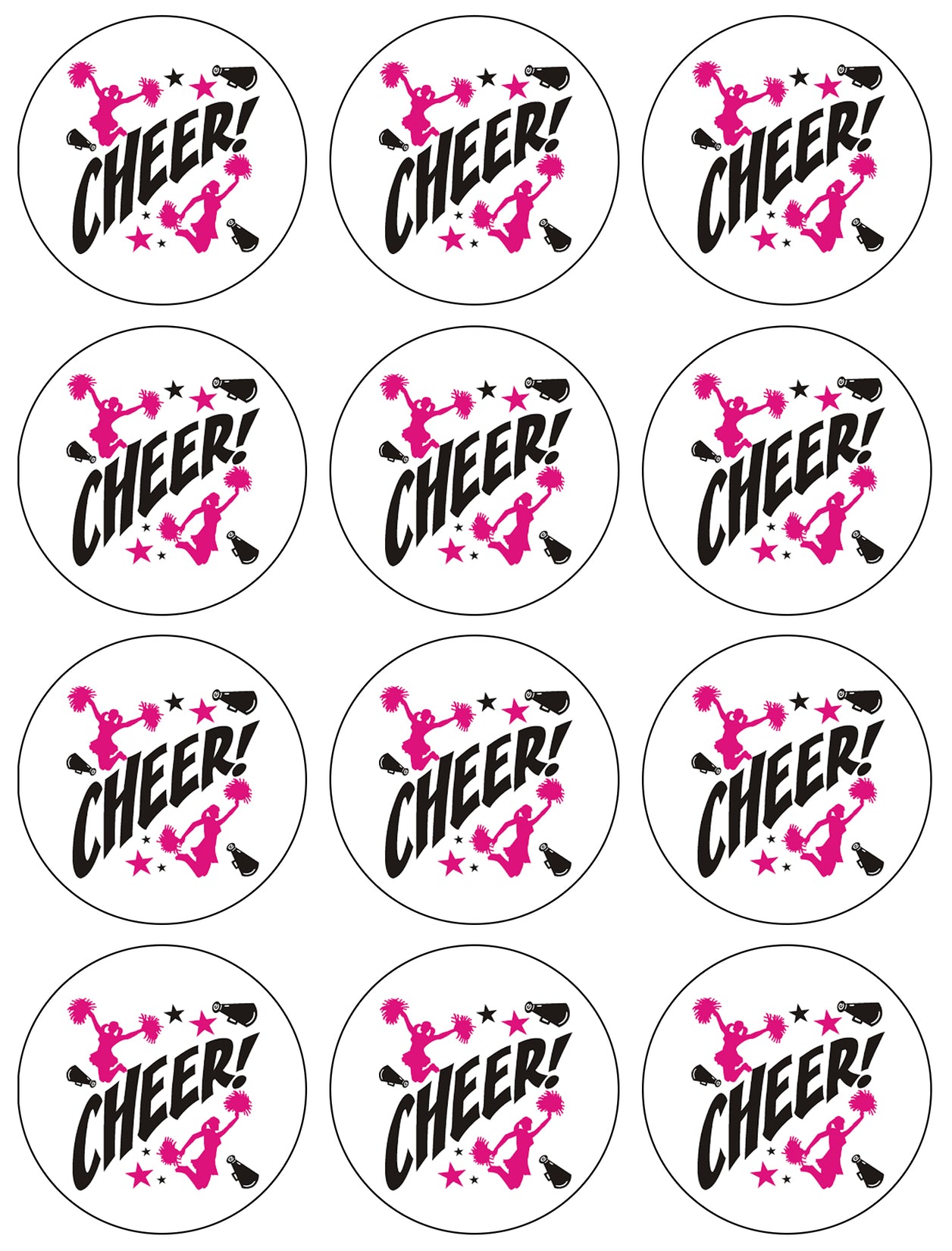 Decorate your Cupcakes with these 12 Count Cheerleading themed Edible Cupcake Topper Images featuring Stars, Megaphones, Pink and Black Cheerleader Silhouettes!