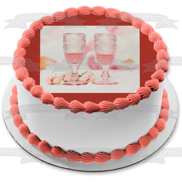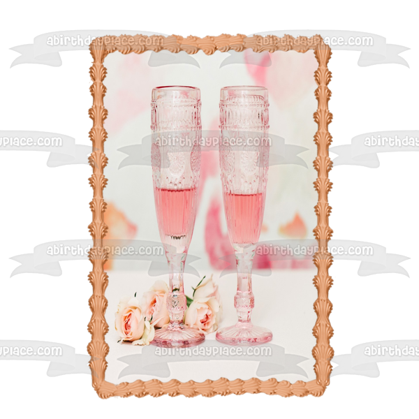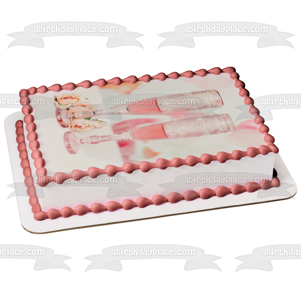 Decorate your Cake with this Pink Champagne in Glasses themed Edible Cake Topper Image featuring Pink Flowers!