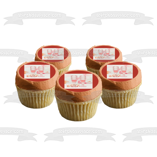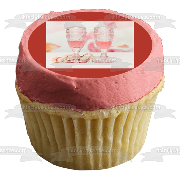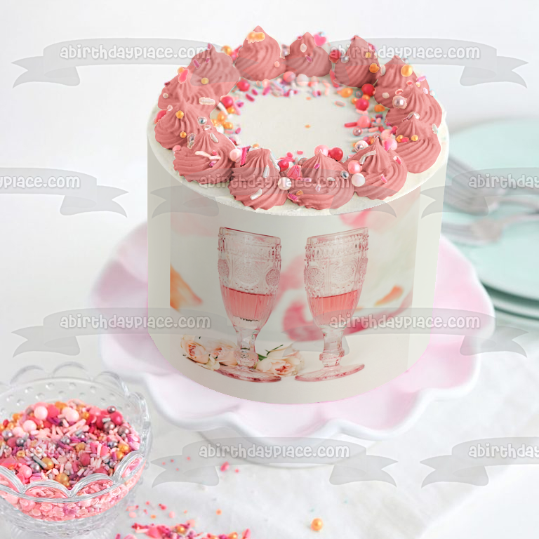 Pink Champagne In Glasses with Pink Flowers Edible Cake Topper Image ABPID56090