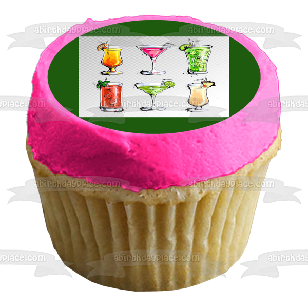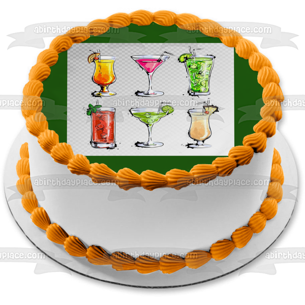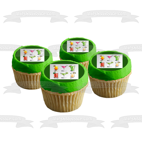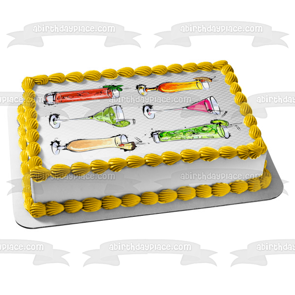 Decorate your Cake with this Mixed Drinks Illustration themed Edible Cake Topper Image featuring a Margarita, Pina Colada and Long Island Iced Tea!