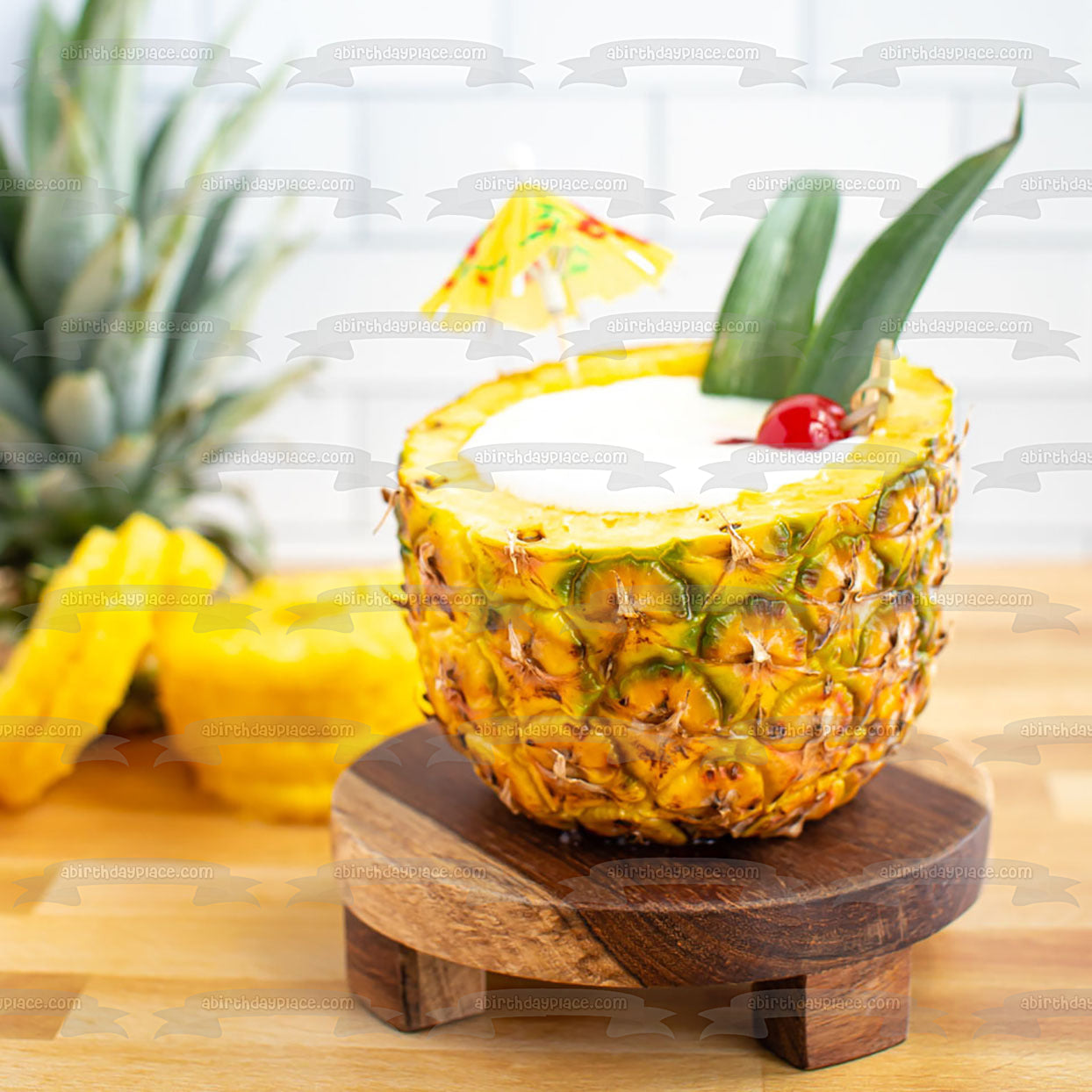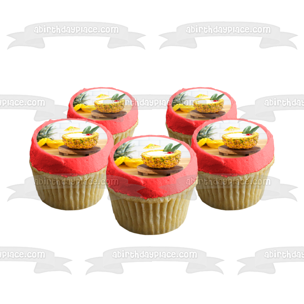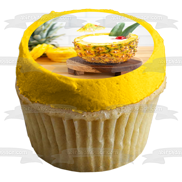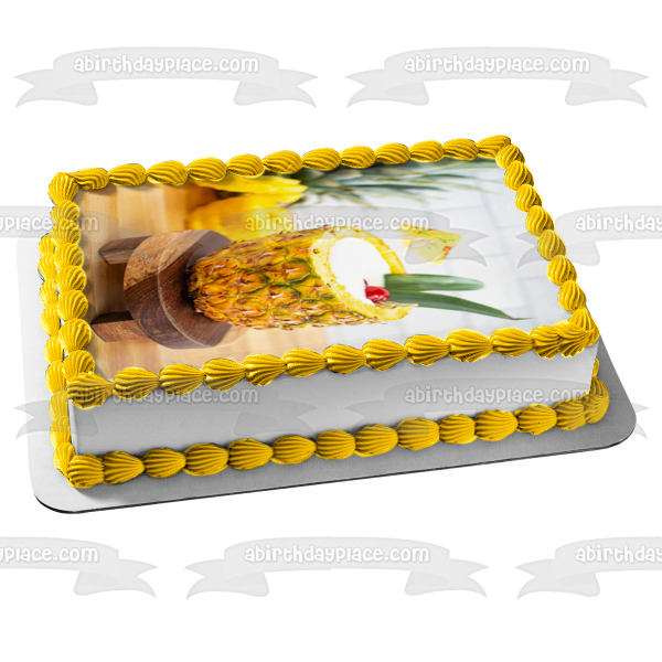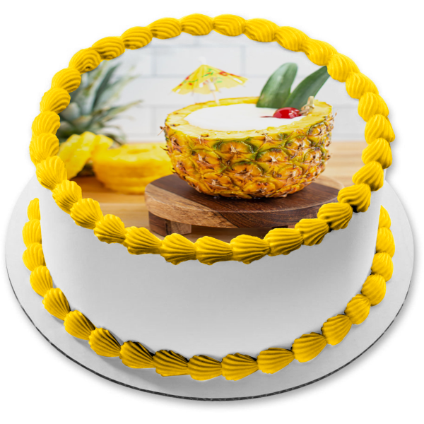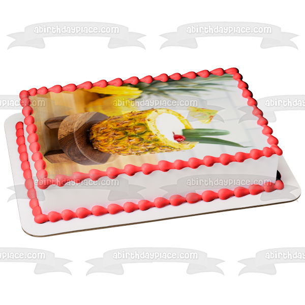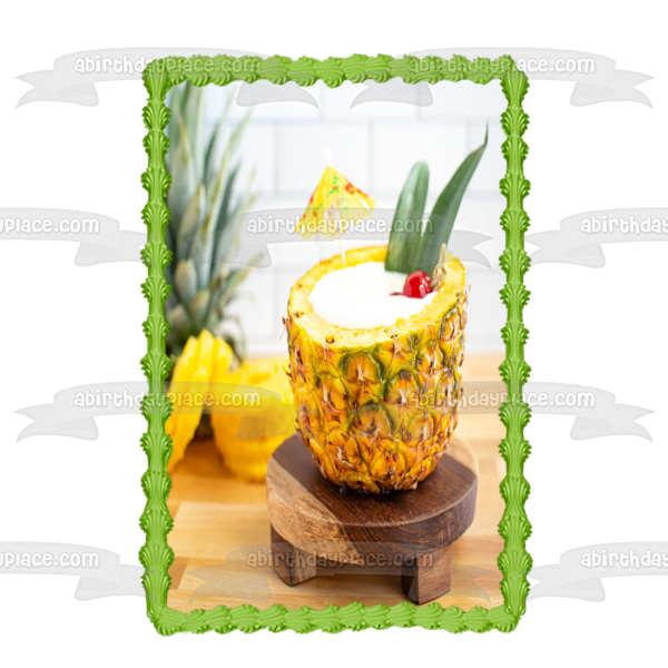 Decorate your Cake with this Pina Colada in a Pineapple themed Edible Cake Topper Image featuring a Drink Umbrella!