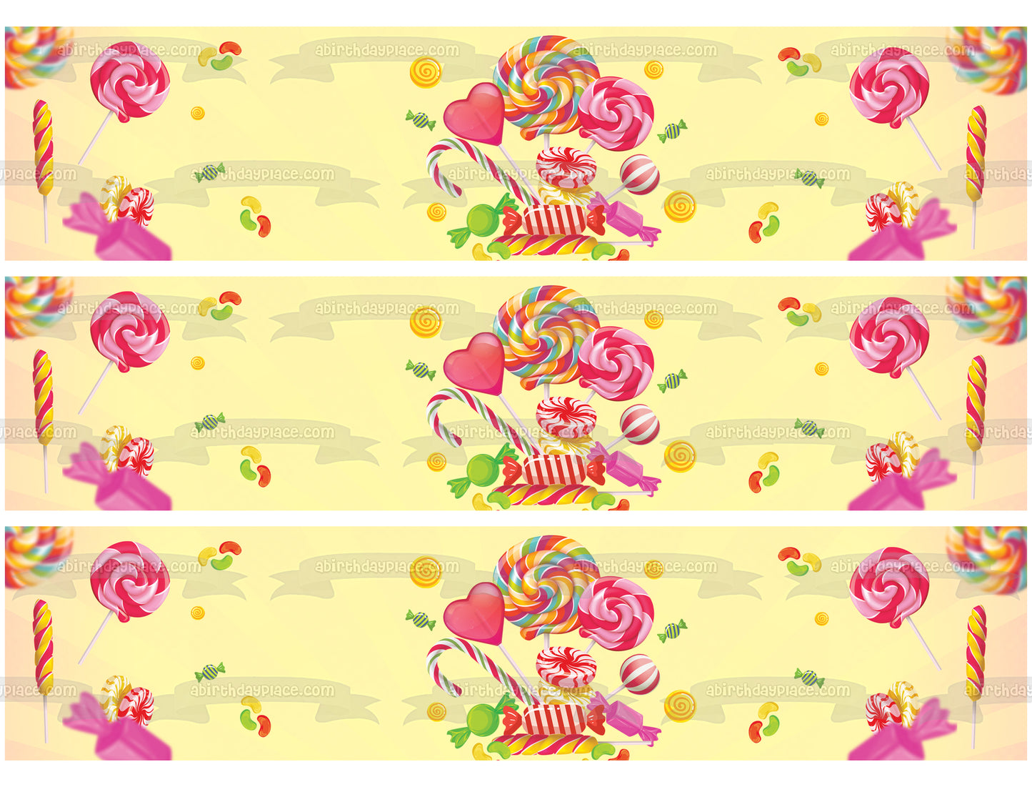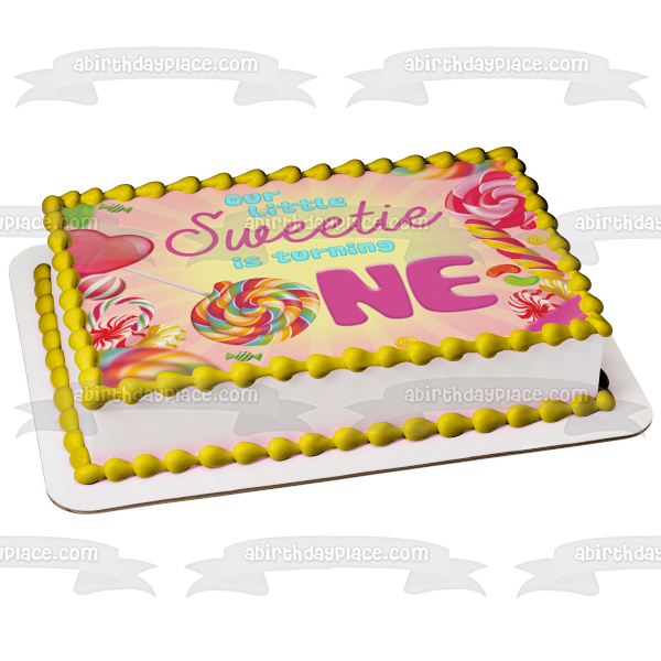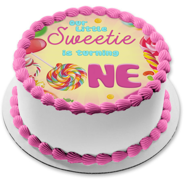 Decorate your Cake with this Our Little Sweetie is Turning One themed Edible Cake Topper Image featuring Candy, Lollipops and Jelly Beans!