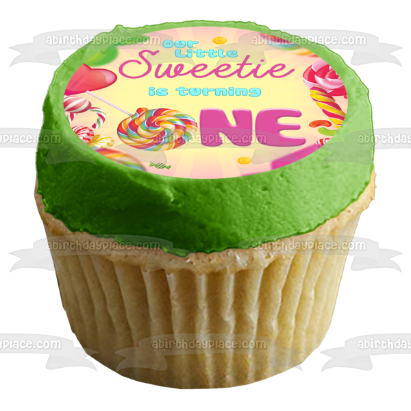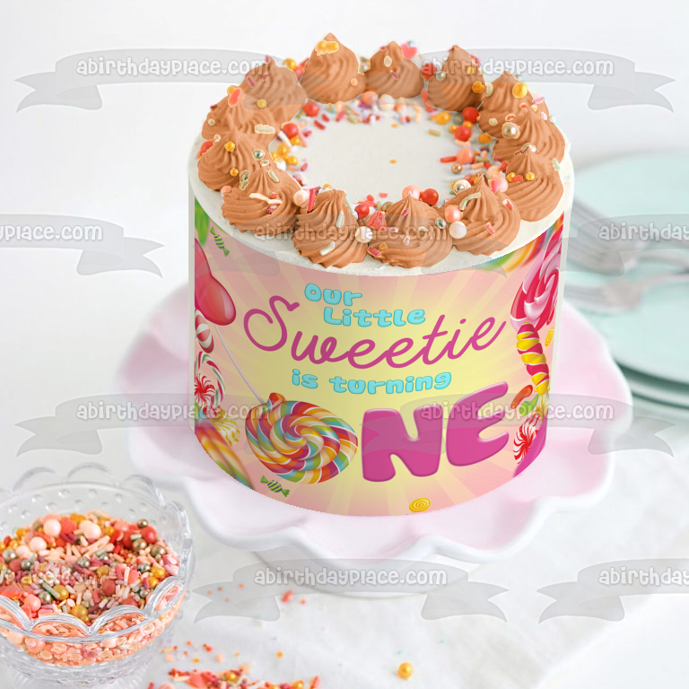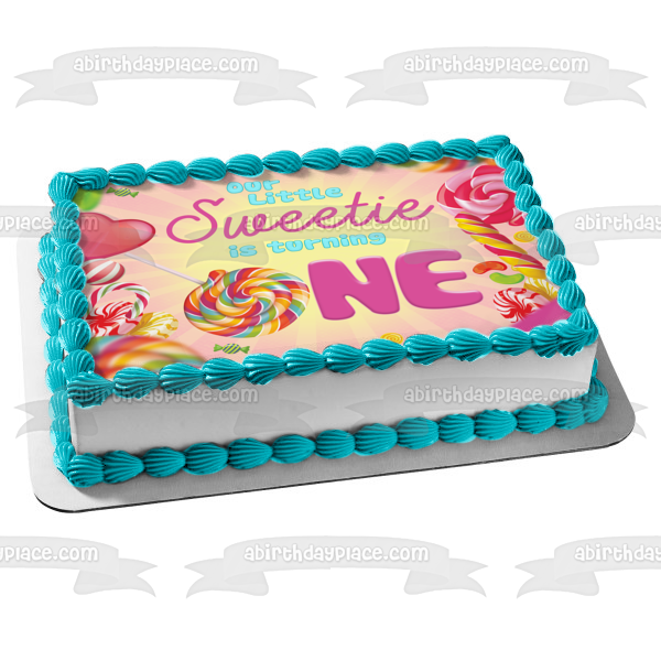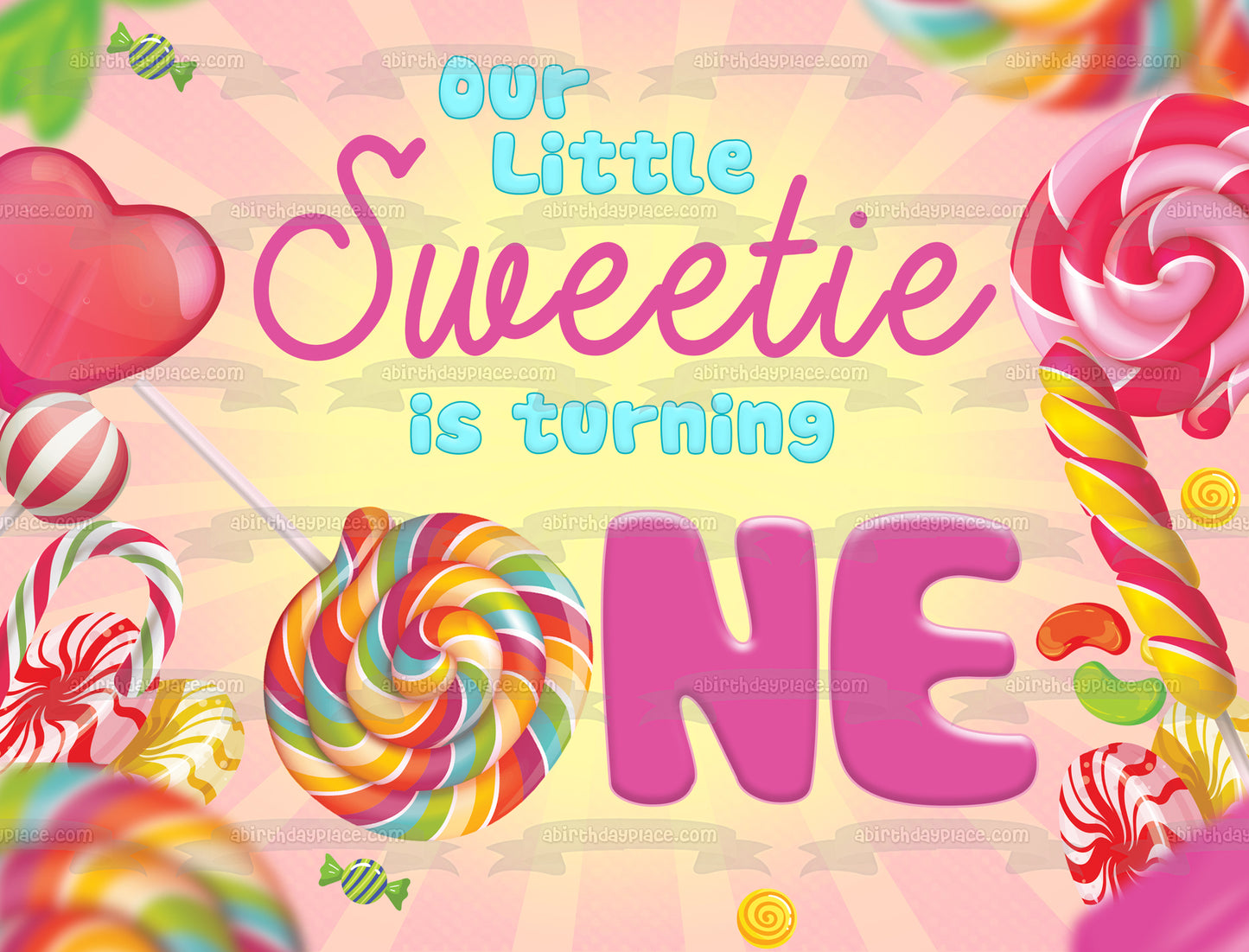 Our Little Sweetie Is Turning One Candy, Lollipops and Jelly Beans Edible Cake Topper Image or Strips ABPID56263