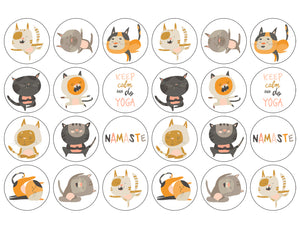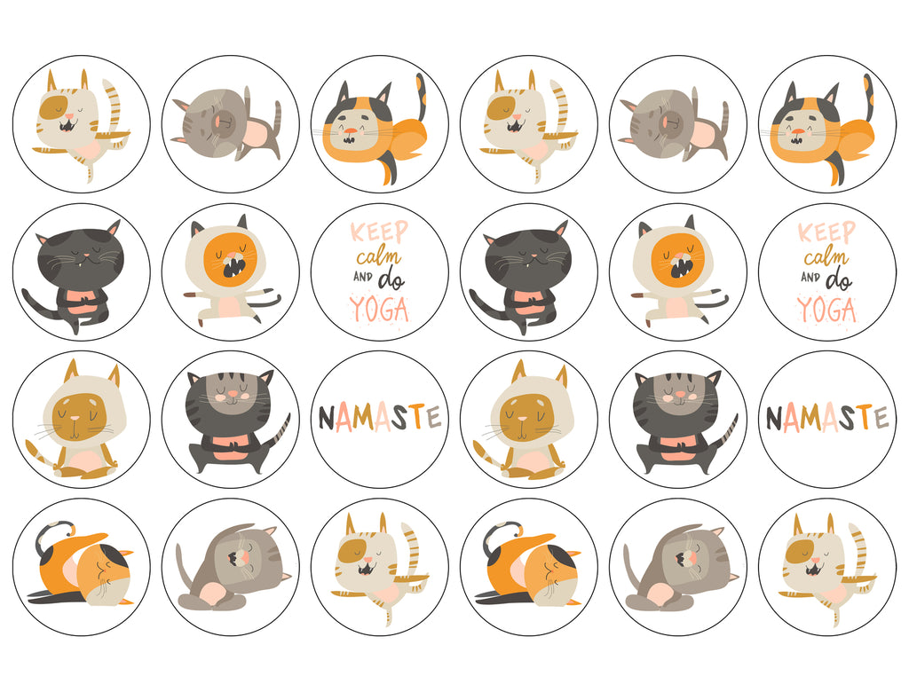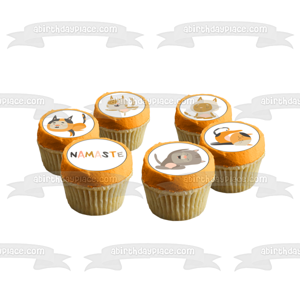 Decorate your Cupcakes with these 24 Count Yoga Cats Cartoon Illustration themed Edible Cupcake Topper Images featuring "Namaste"!
