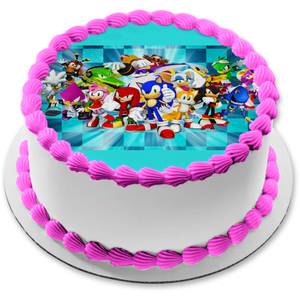 Decorate your Cake with this Sonic Cast themed Edible Cake Topper Image featuring Tails, Amy Rose and Knuckles with a Checkers Background!
