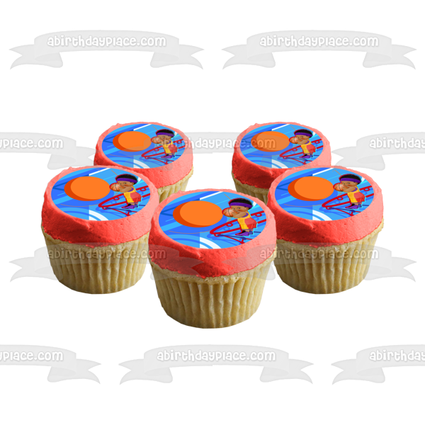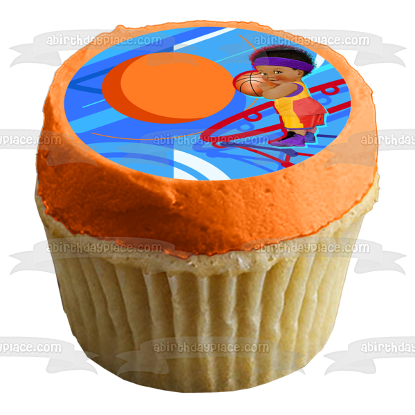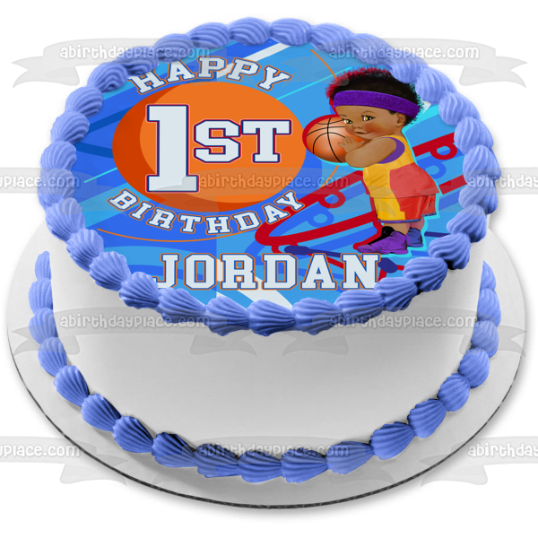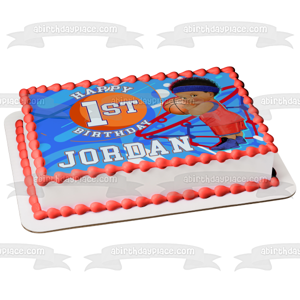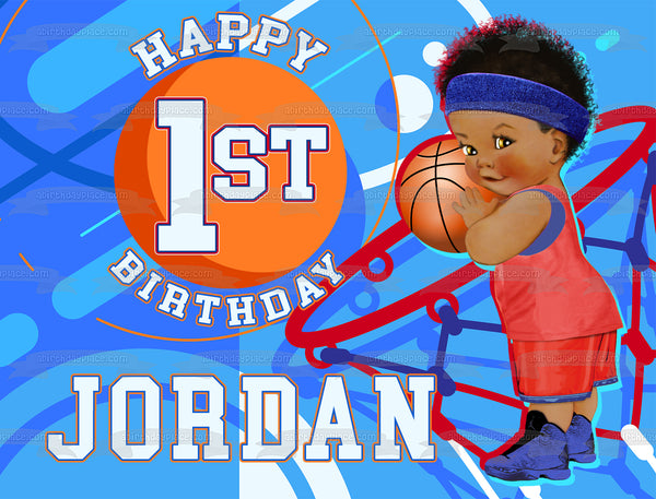 Decorate your Cake with this Baby Basketball themed Edible Cake Topper Image featuring your Personalized Happy 1st Birthday!