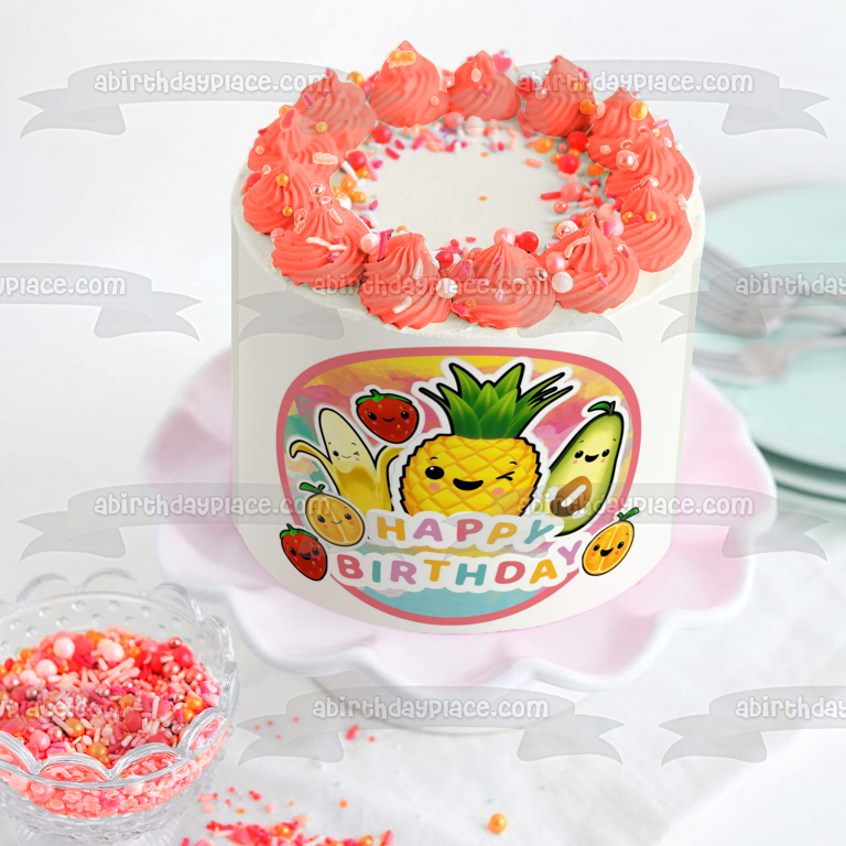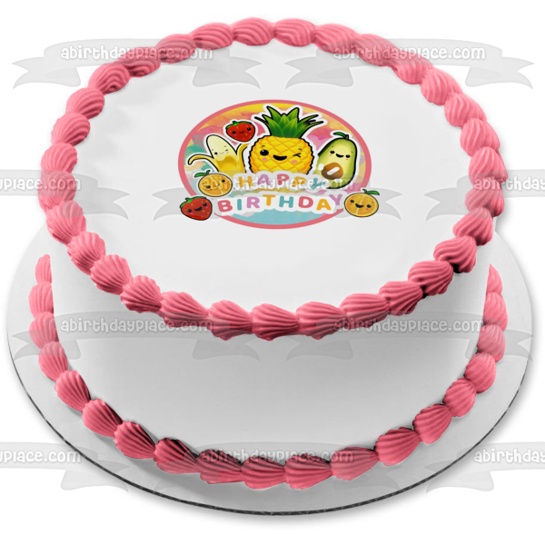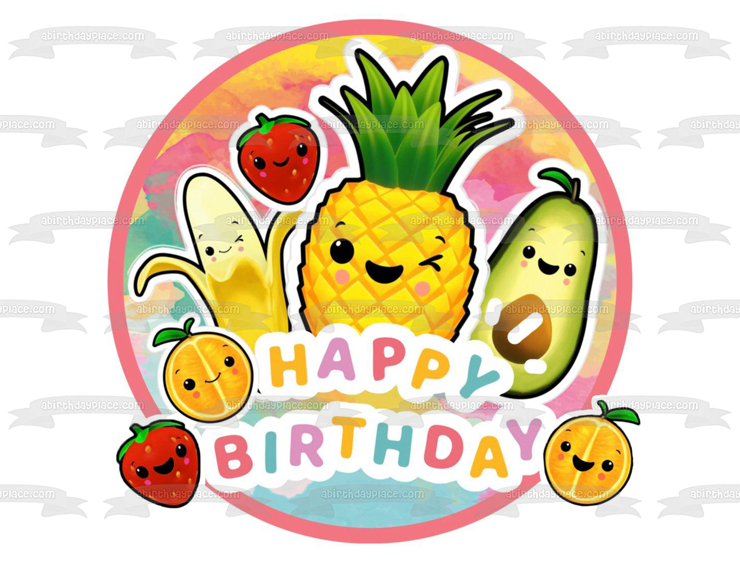 Decorate your Cake with this Happy Fruits Happy Birthday themed Edible Cake Topper Image featuring Pineapple, Banana, Strawberry and an Orange!