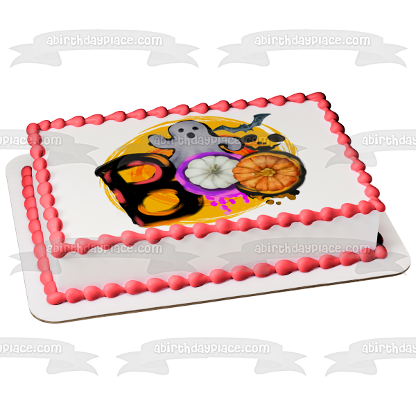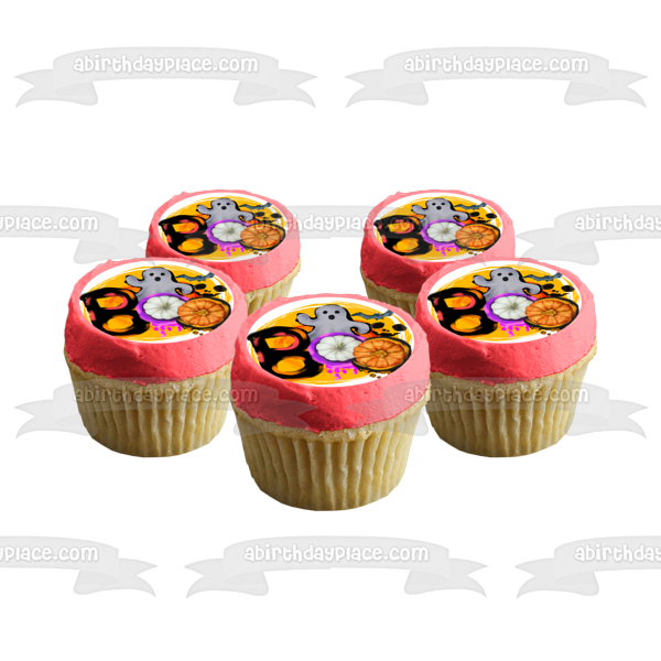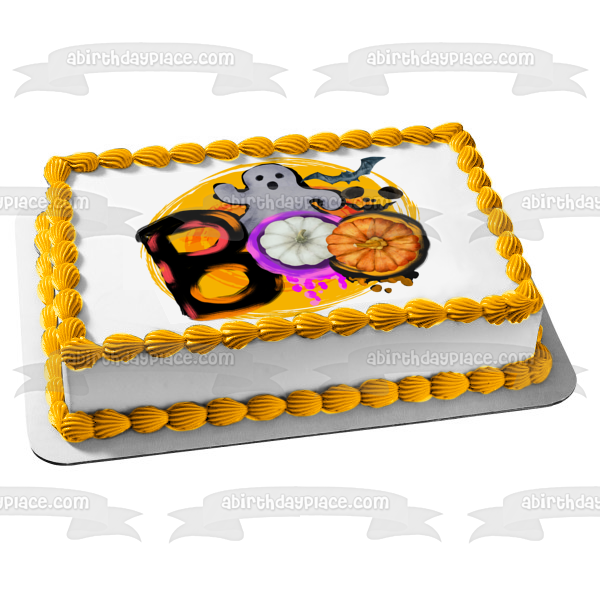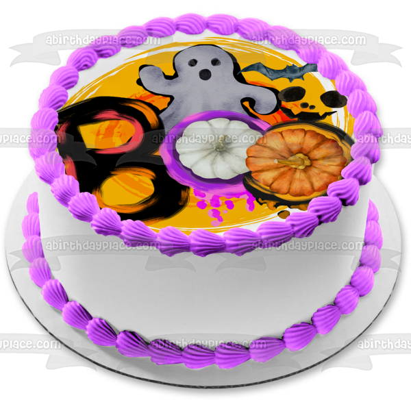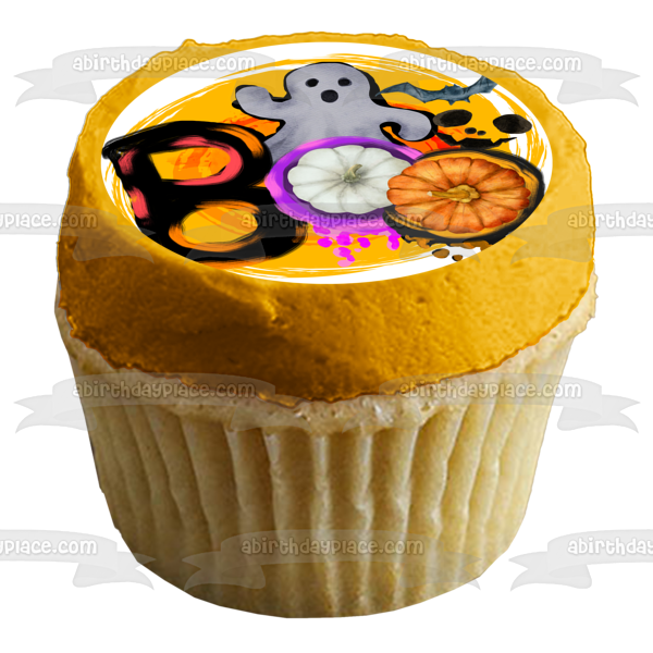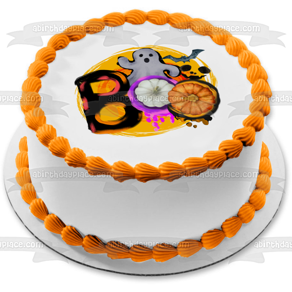 Decorate your Cake with this Boo Halloween themed Edible Cake Topper Image featuring a Ghost, Pumpkins and Bats!