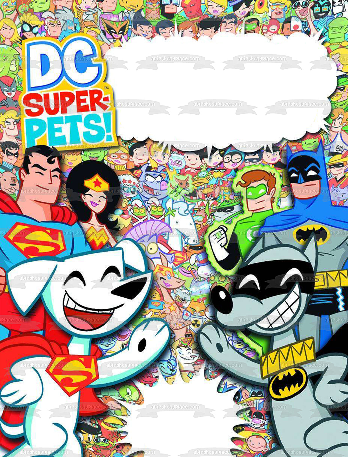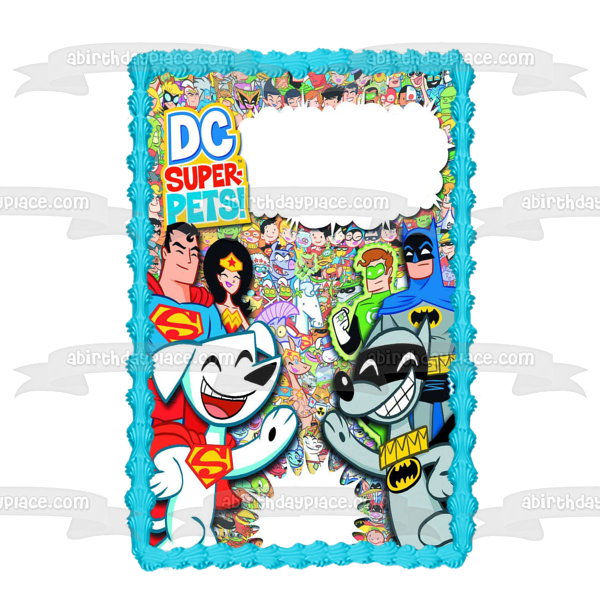 Decorate your Cake with this DC League of Super Pets themed Edible Cake Topper Image featuring Superman, Batman, Green Lantern, Wonder Woman, Flash ,Ace, Bat-Hound and Krypto!