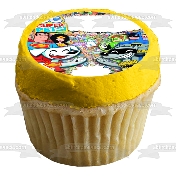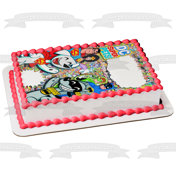 Decorate your Cake with this DC League of Super Pets themed Edible Cake Topper Image featuring Superman, Batman, Green Lantern, Wonder Woman, Flash ,Ace, Bat-Hound and Krypto!