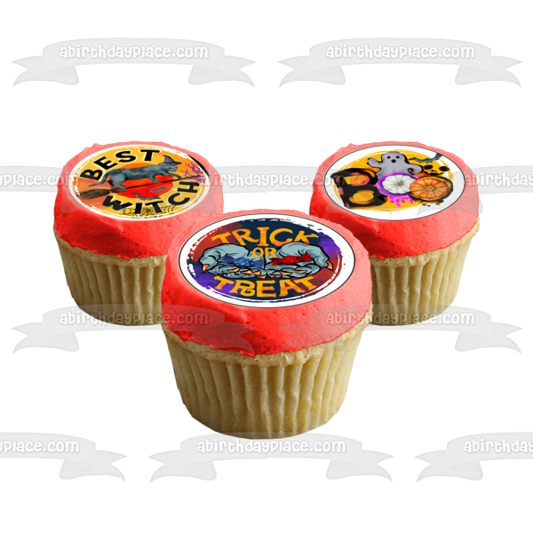 Halloween Stylized Pop Color Jack O' Lanterns Black Cats Ghosts and Witches Edible Cupcake Topper Images ABPID56595