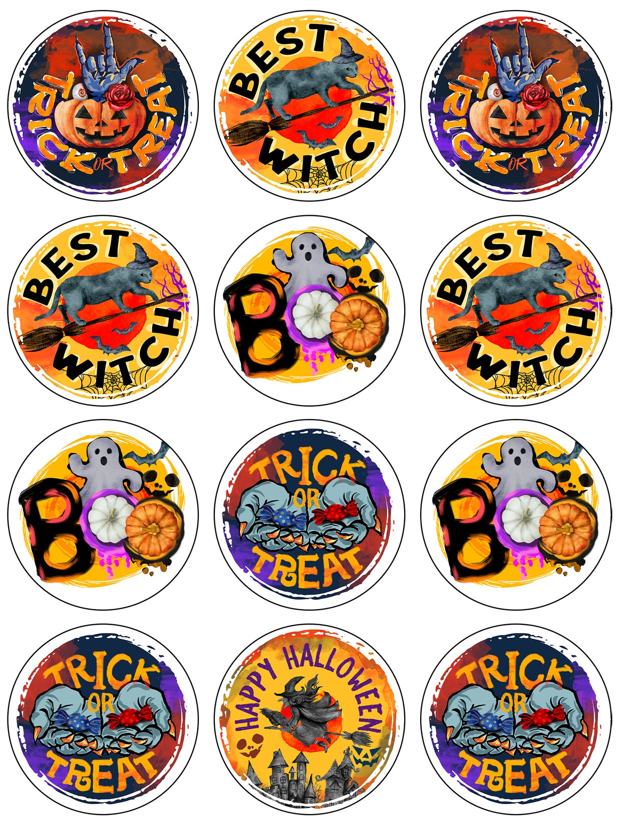 Decorate your cupcakes with these Halloween Stylized Pop Color themed Edible Cupcake Topper Images featuring Jack O'Lanterns, Black Cats, Ghosts and Witches!