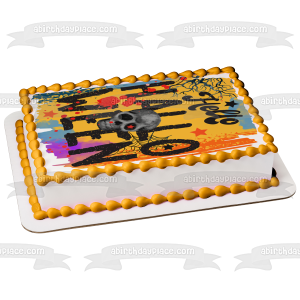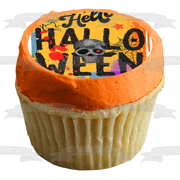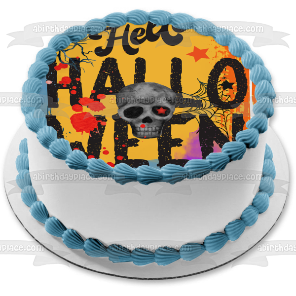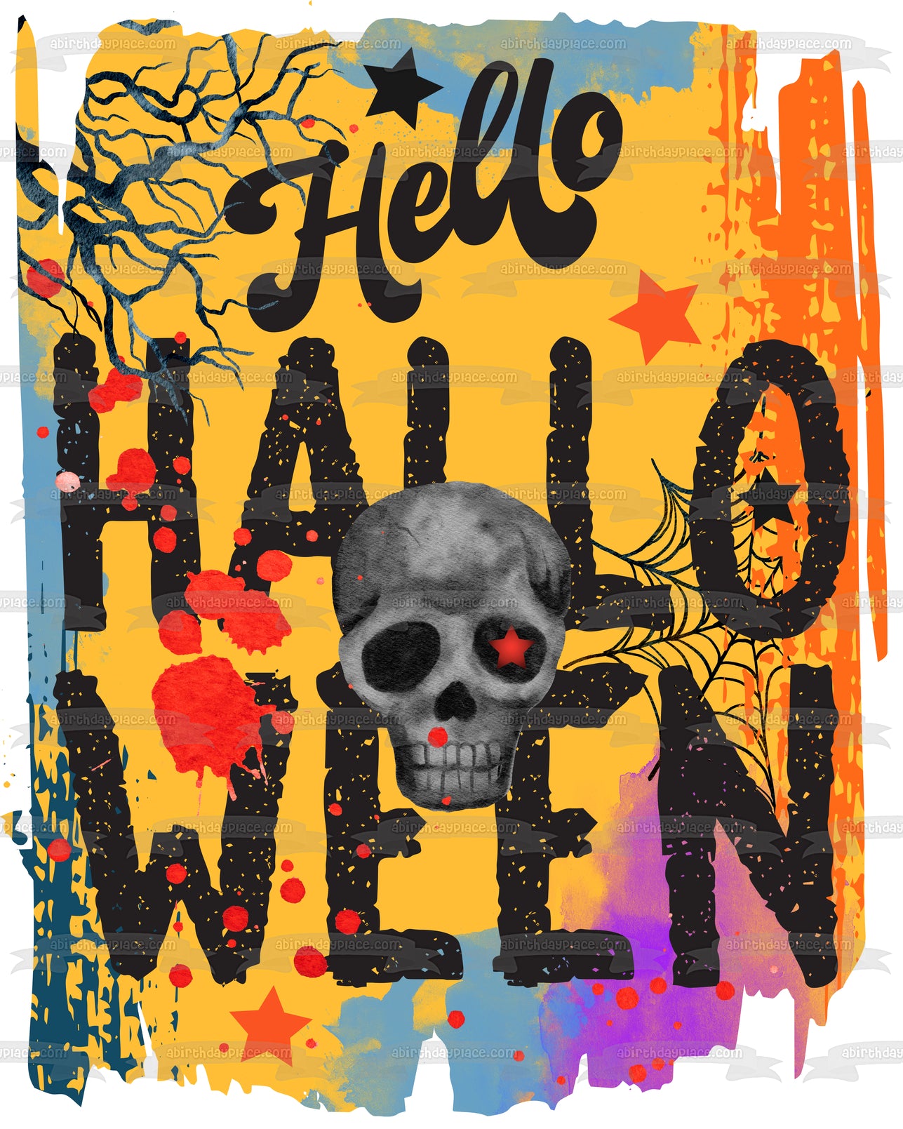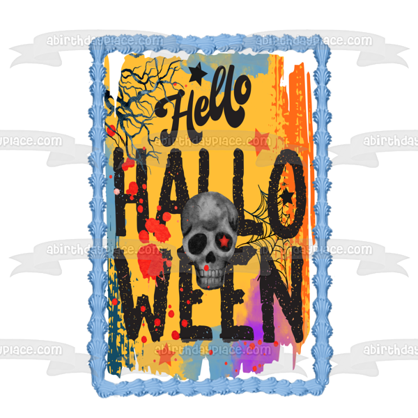 Decorate your Cake with this Hello Halloween themed Edible Cake Topper Image featuring a Skull, Blood Spatter and Stars!