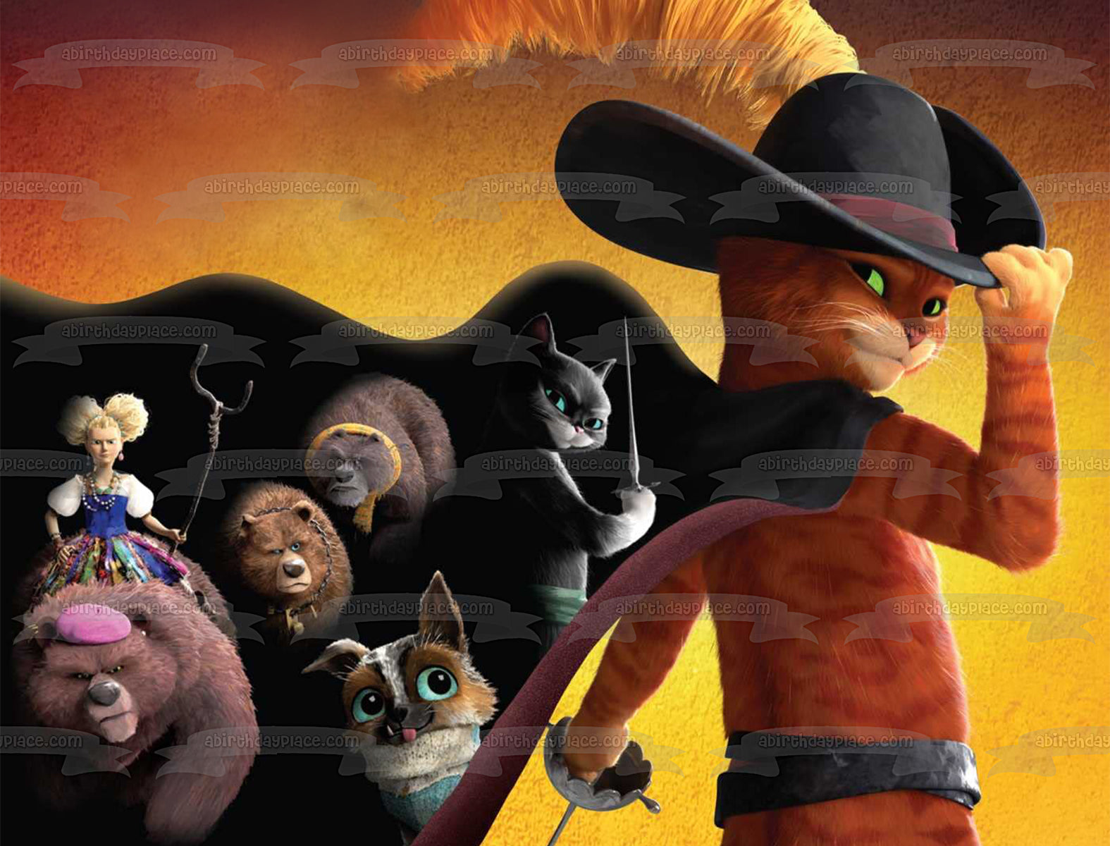 Decorate your Cake with this Puss in Boots The Last Wish themed Edible Cake Topper Image featuring Goldilocks, The Three Bears, Perro Kitty, Softpaws and a Billowing Cape!