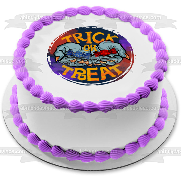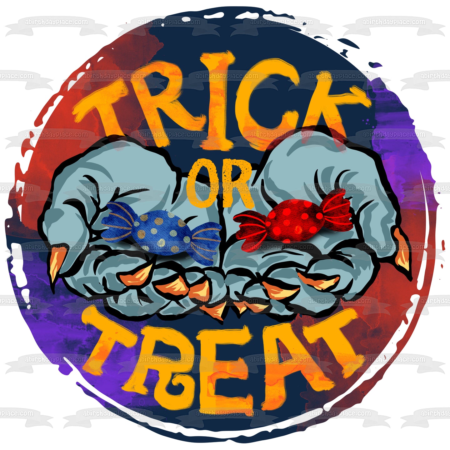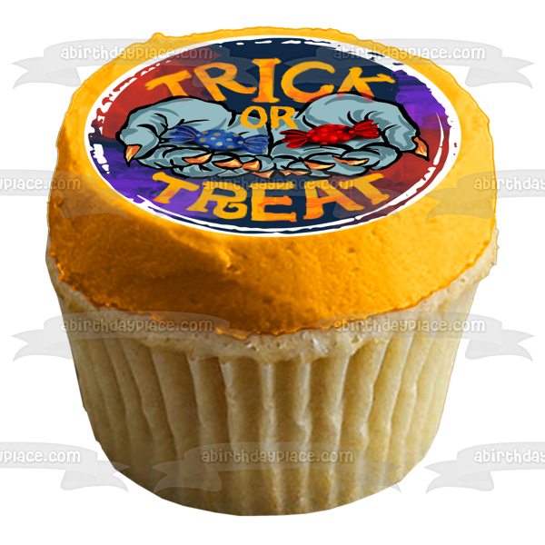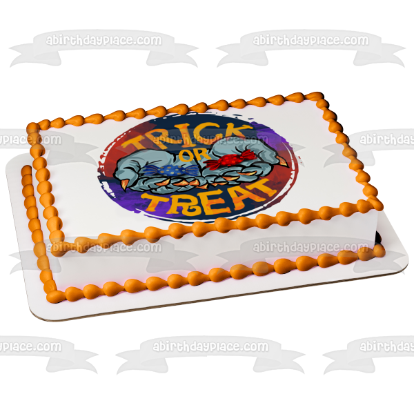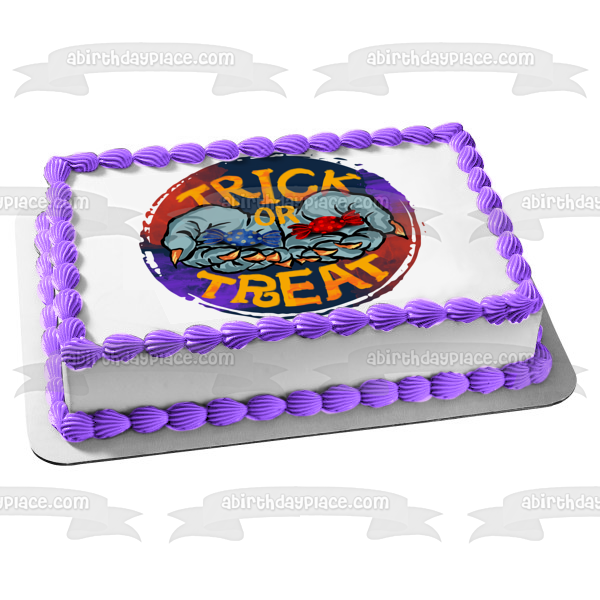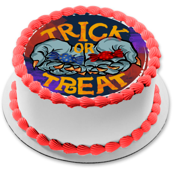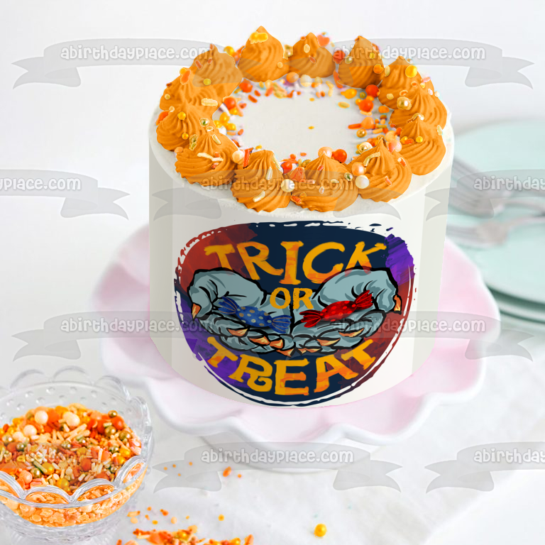 Decorate your Cake with this Trick or Treat themed Edible Cake Topper Image featuring Witch Hands Full of Candy!