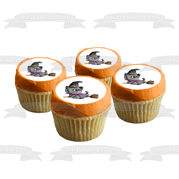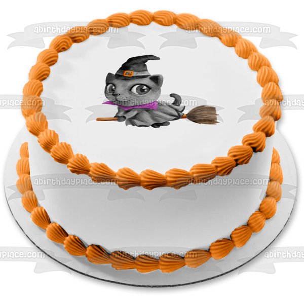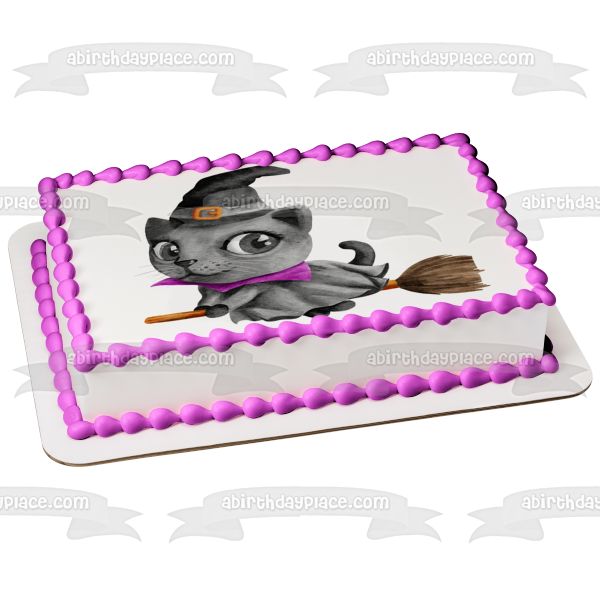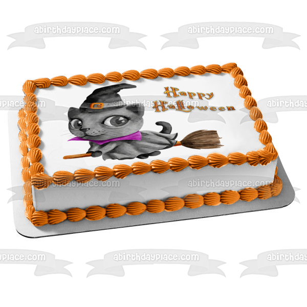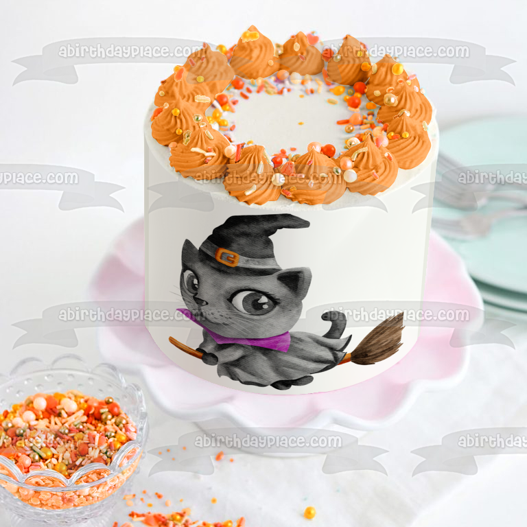 Decorate your Cake with this Happy Halloween themed Edible Cake Topper Image featuring a Witch Cat on a Broom Watercolor Illustration!