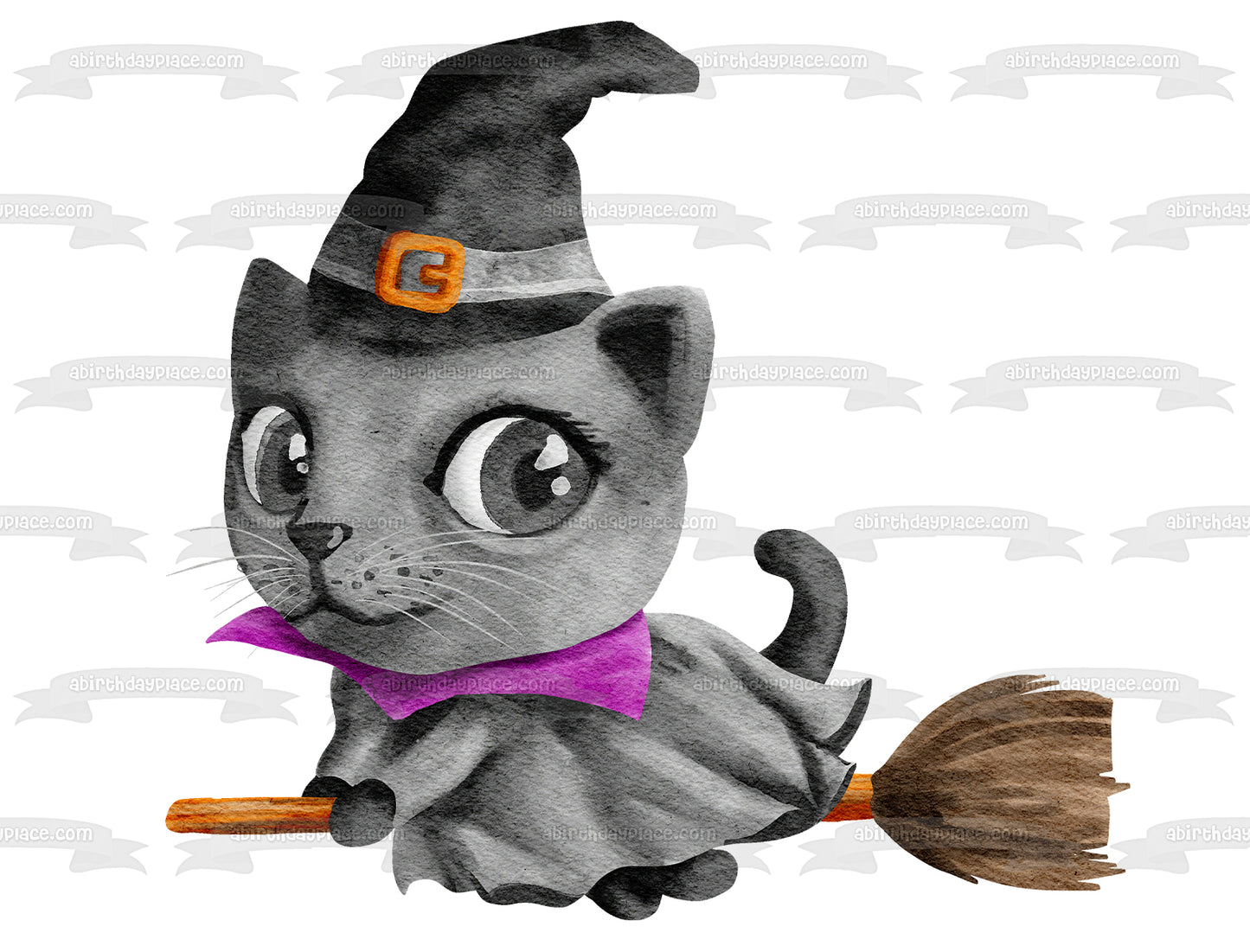 Happy Halloween Witch Cat on a Broom Watercolor Illustration Edible Cake Topper Image ABPID56652