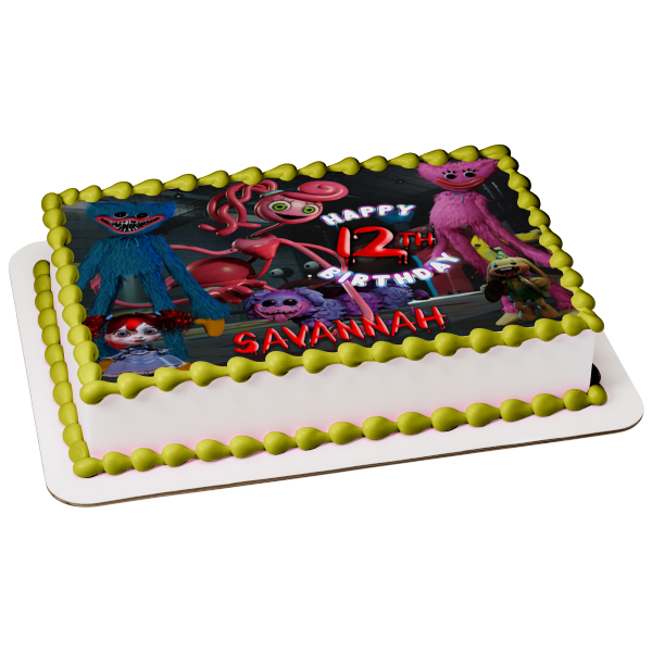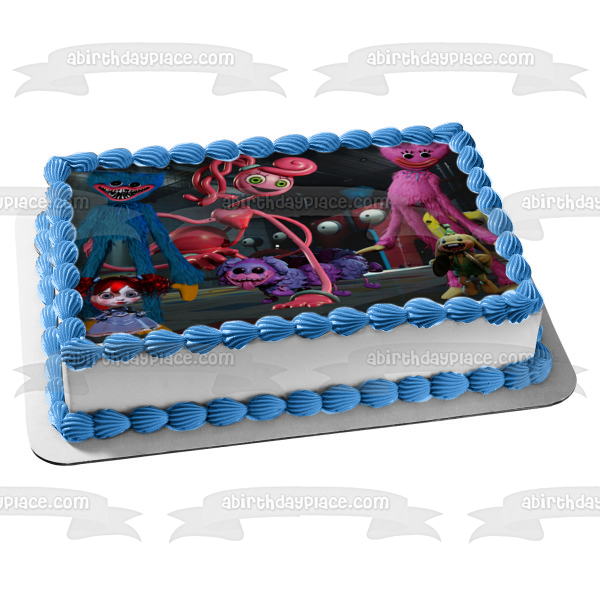Decorate your Cake with this Poppy's Playtime Chapters themed Edible Cake Topper Image featuring Huggy Wuggy, Kissy Missy, Mommy Long Legs, PJ Pug and A-Pillar!