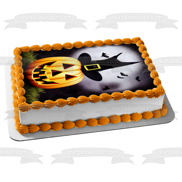 Decorate your Cake with this Happy Halloween themed Edible Cake Topper Image featuring a Happy Jack O' Lantern wearing a Witch Hat and Bats Flying!