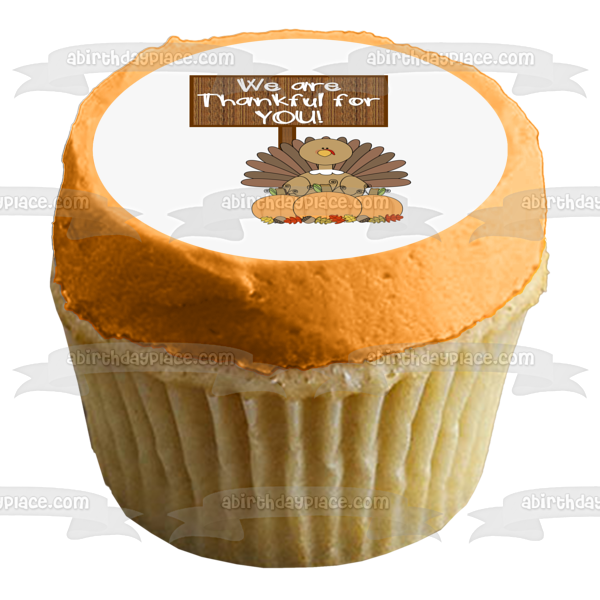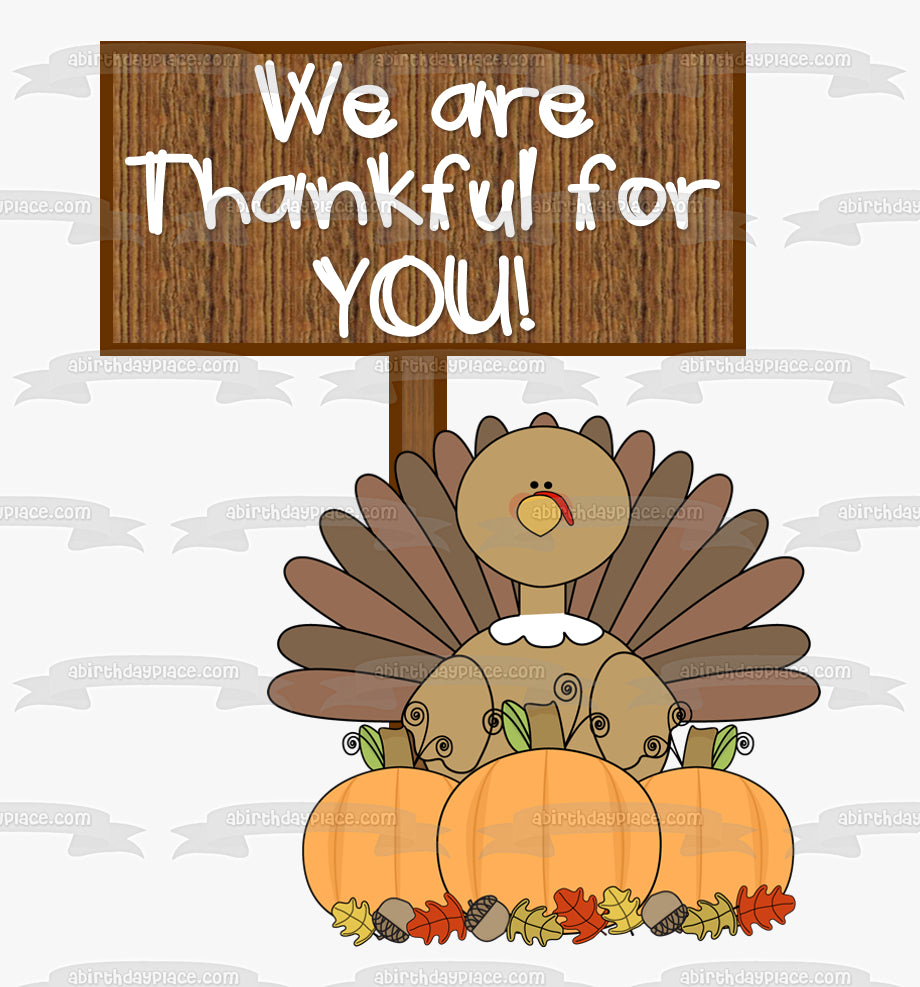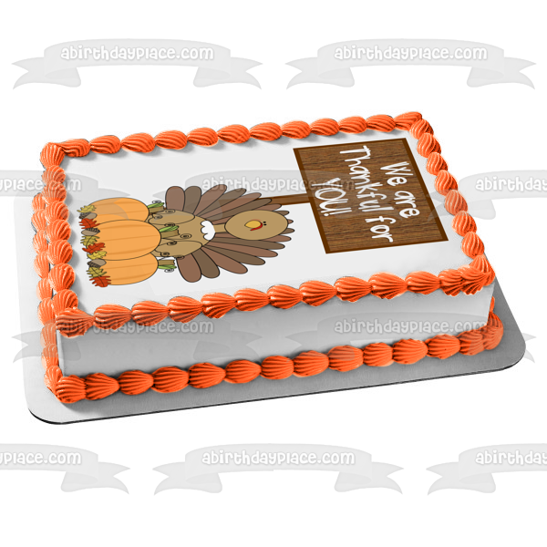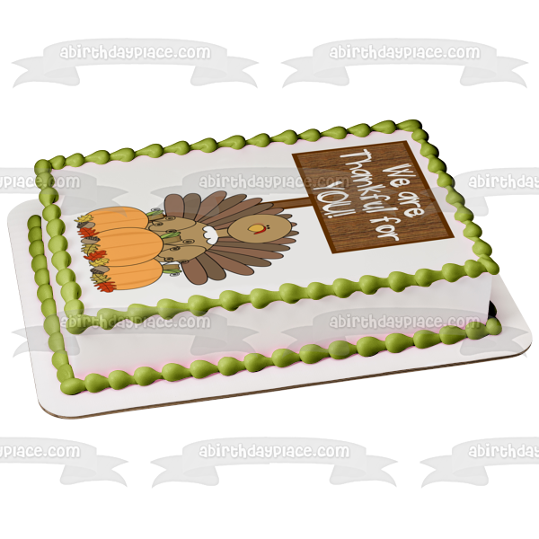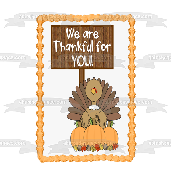 Decorate your Cake with this Happy Thanksgiving We Are Thankful for You themed Edible Cake Topper Image featuring a Turkey and Pumpkins!