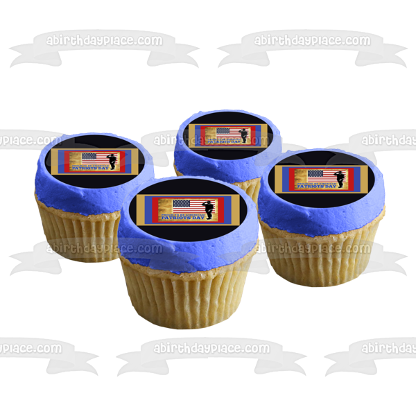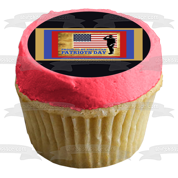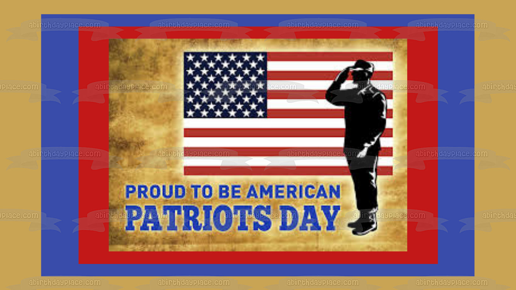 Decorate your Cake with this Happy Patriot's Day themed Edible Cake Topper Image featuring "Proud to be American", a Soldier and the American Flag!