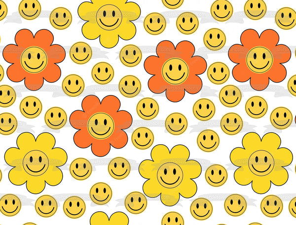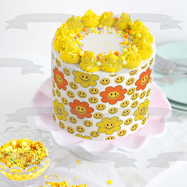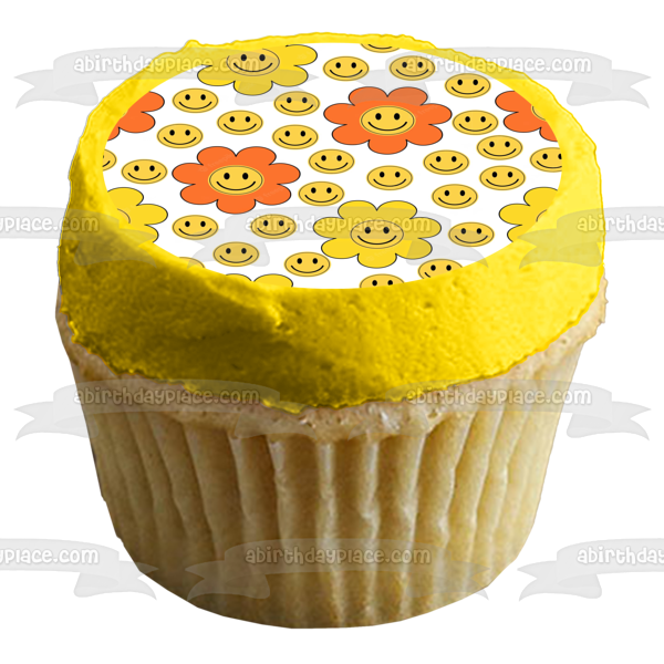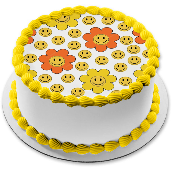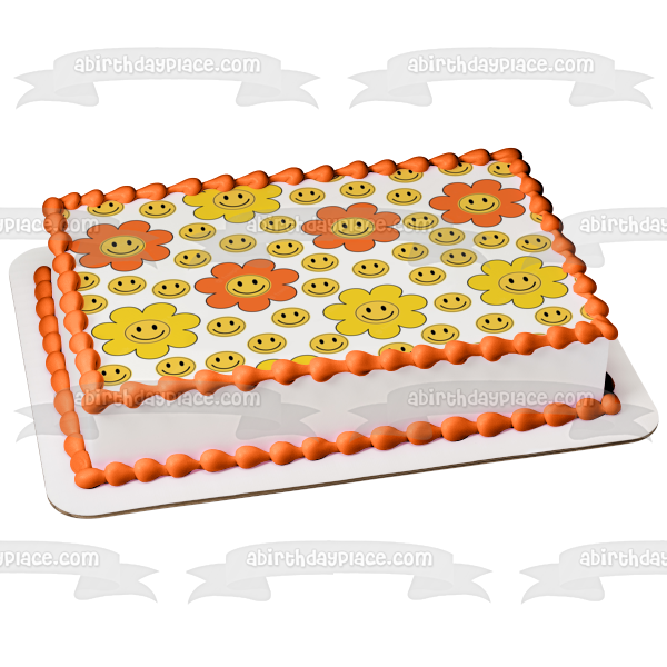 Decorate your Cake with this Yellow and Orange Retro Smiley Face Flowers themed Edible Cake Topper Image!