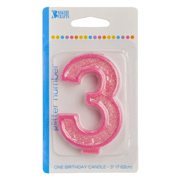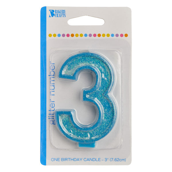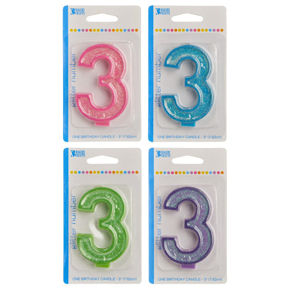 Celebrate birthdays with this glitter candle. Numeral birthday candle is molded with glitter inlay design. Choose from purple, pink, green, and blue.