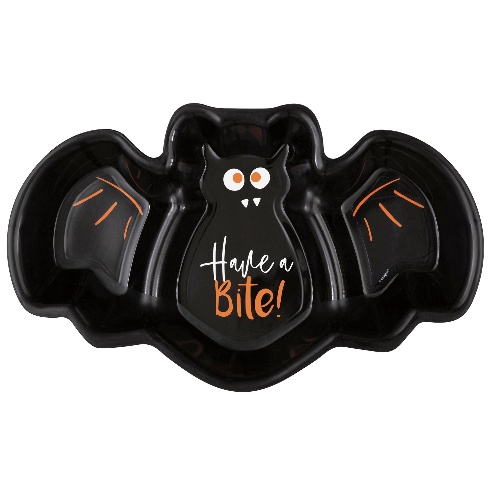 Throw a fun Halloween celebration with this Bat-shaped serving tray! The black BPA-free plastic bowl is perfect for snacks or candy and is a bat-shape and features the phrase "Have a Bite!".