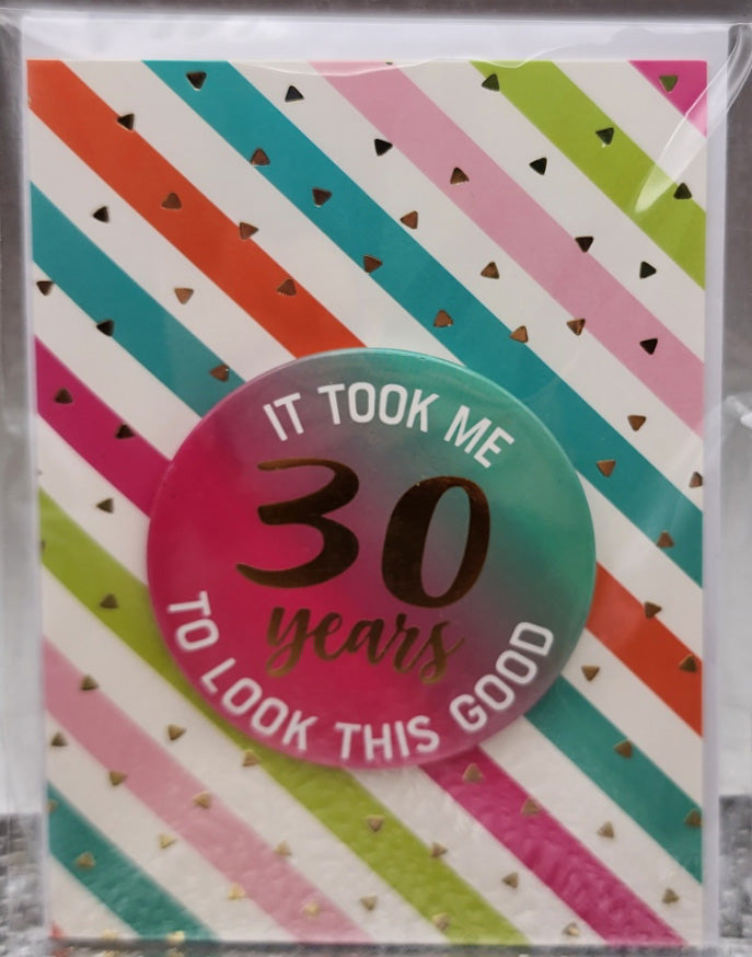 Birthday design greeting card with a matching button design pin in styles and colors. Available in 8 assorted designs: ANOTHER YEAR OLDER AND NONE THE WISER, SUDDENLY SENIOR, LIVE LIFE AND FORGET ABOUT AGE, AGED TO PERFECTION, I'M NOT OLDER, I'M VINTAGE, I'M 20 FOR THE SECOND TIME. Choose your design from the drop-down menu.