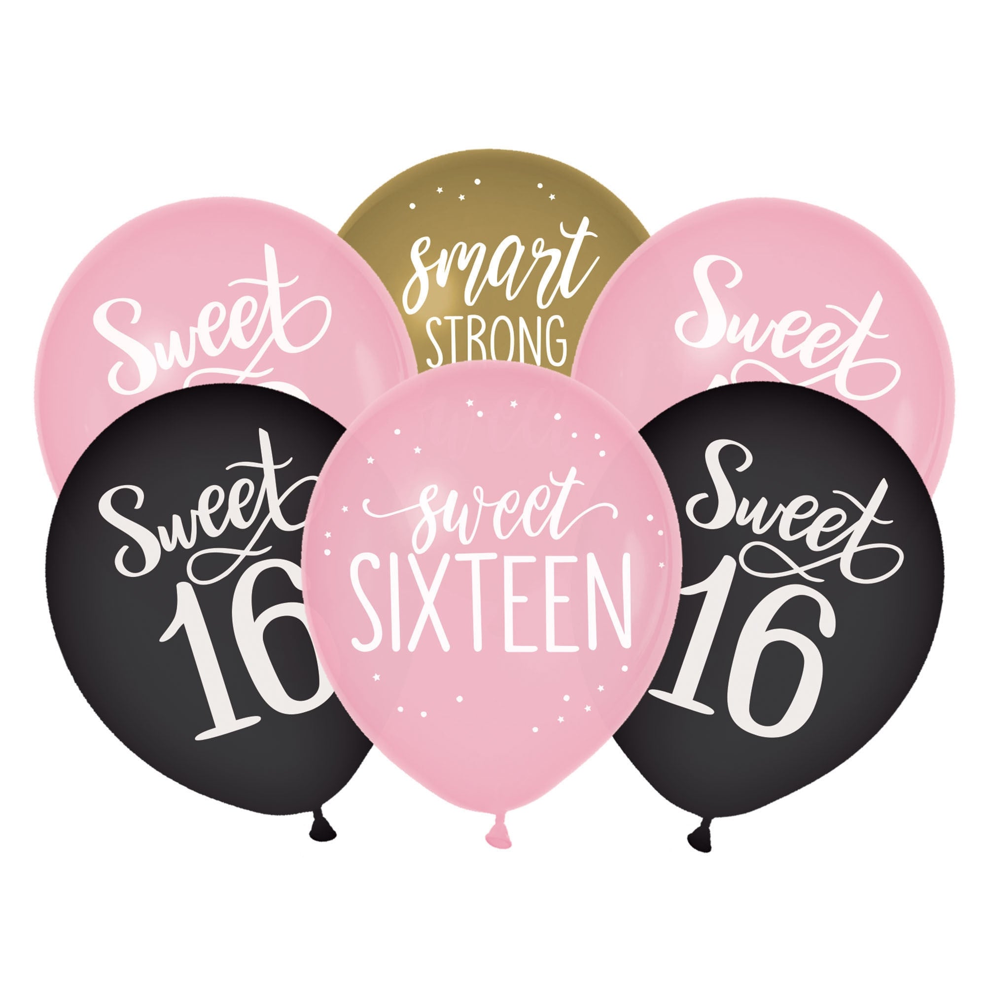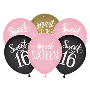 Blow away guests with a grand balloon display made up of Gold & Pink Sweet 16 Balloons! The pack comes with black, gold, and pink latex balloons that read "Sweet Sixteen" and "Smart Strong Sweet." Disperse the balloons around the party space or bunch them together to create a balloon bouquet that's just as sweet as the guest of honor.