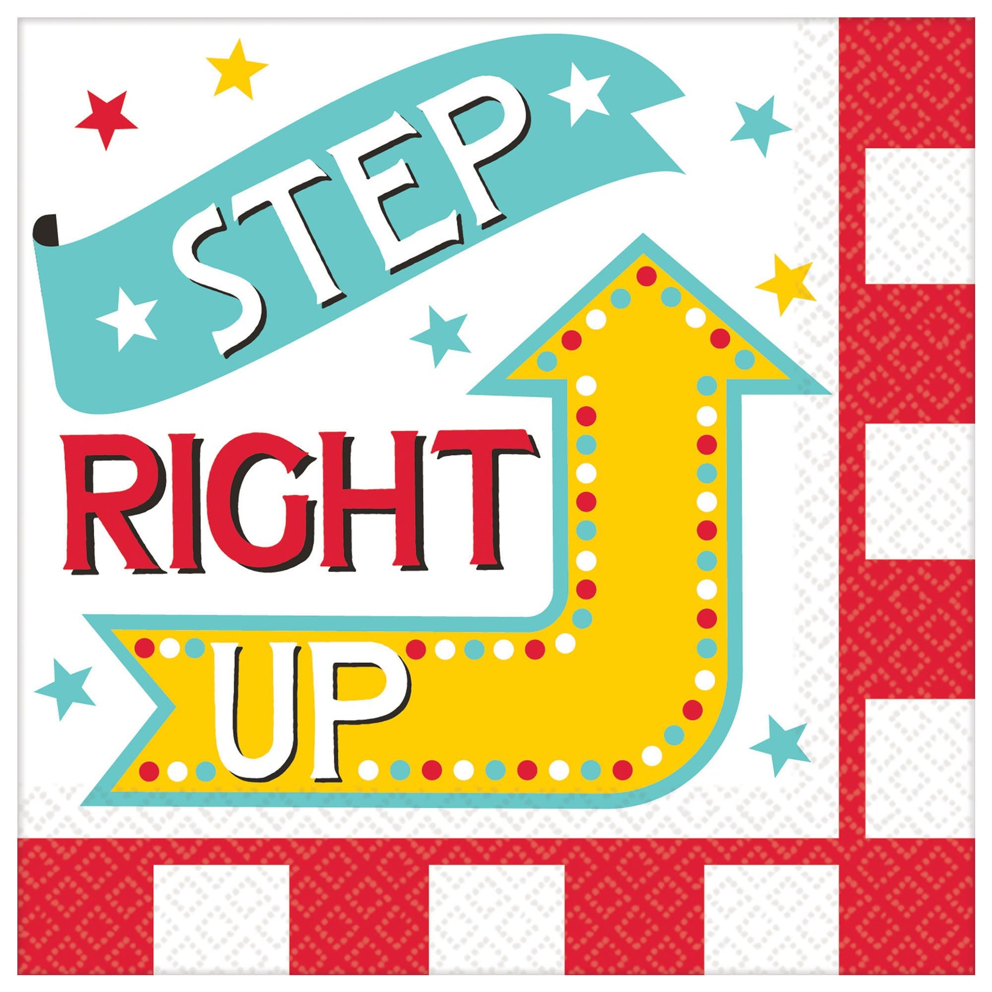 No circus-themed party is complete without Carnival Beverage Napkins! These small paper napkins feature a red and white striped border and a "Step Right Up" headline against a white background. Colorful stars complete the design on these disposable napkins. Leave a stack of small paper napkins on the beverage table for guests to enjoy at a carnival birthday party!