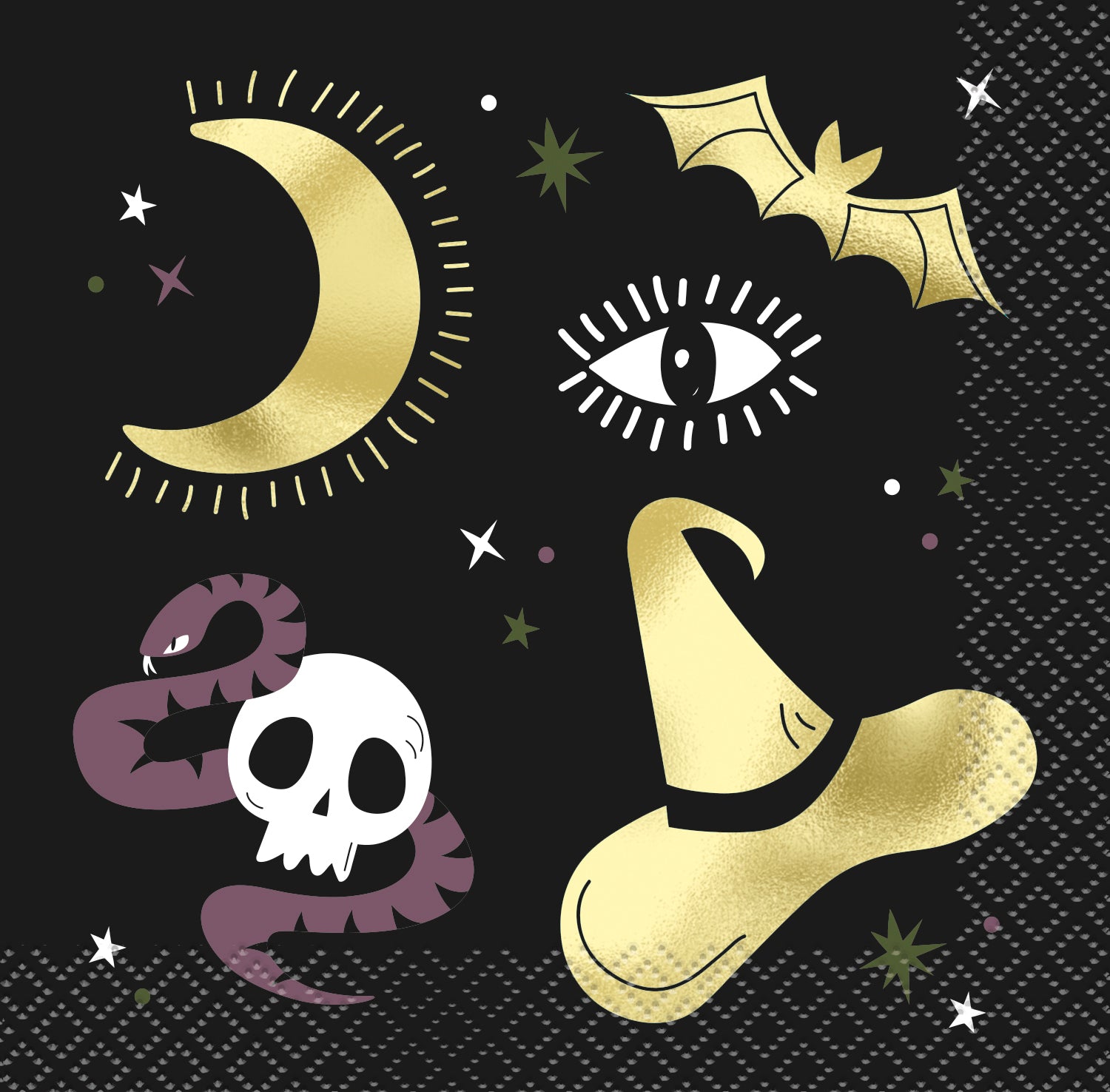 Don't let spills and messes haunt you this Halloween - just keep these on hand! Perfect for Halloween party supplies, these napkins feature a design of metallic Halloween icons. Set 'em next to your frightening feast on the buffet table or place around the celebration space as creepy coasters.