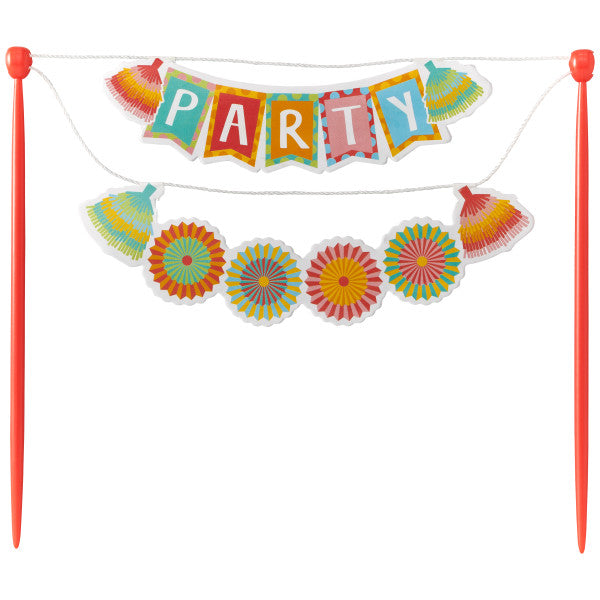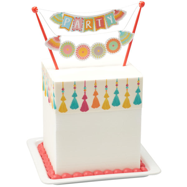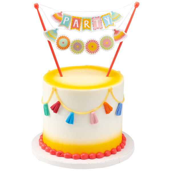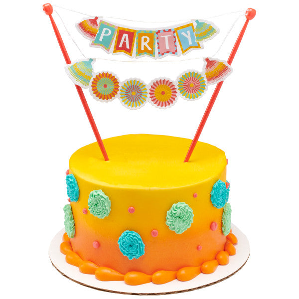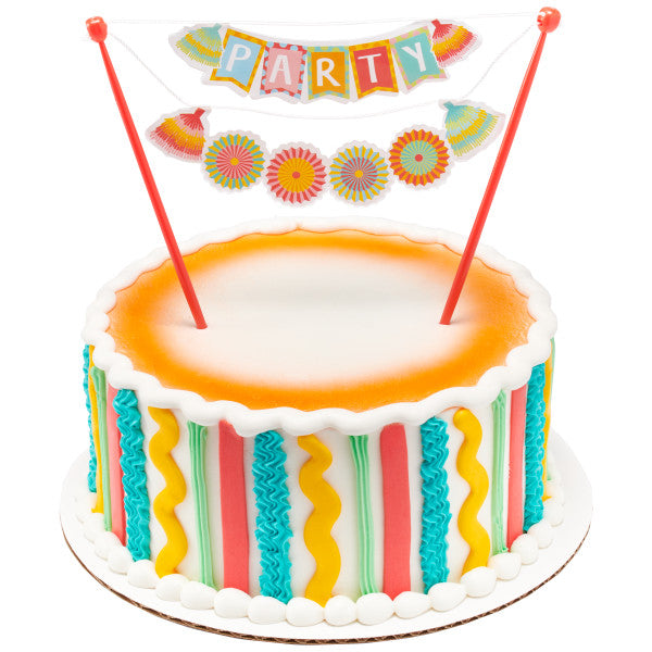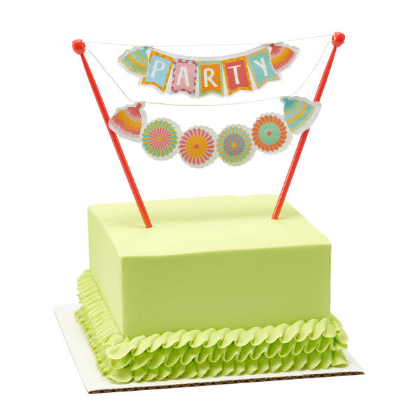 Elevate your celebration cake! This cake topping banner has a classic, backyard party look that adds another dimension to your cake design. Made with food safe plastic.