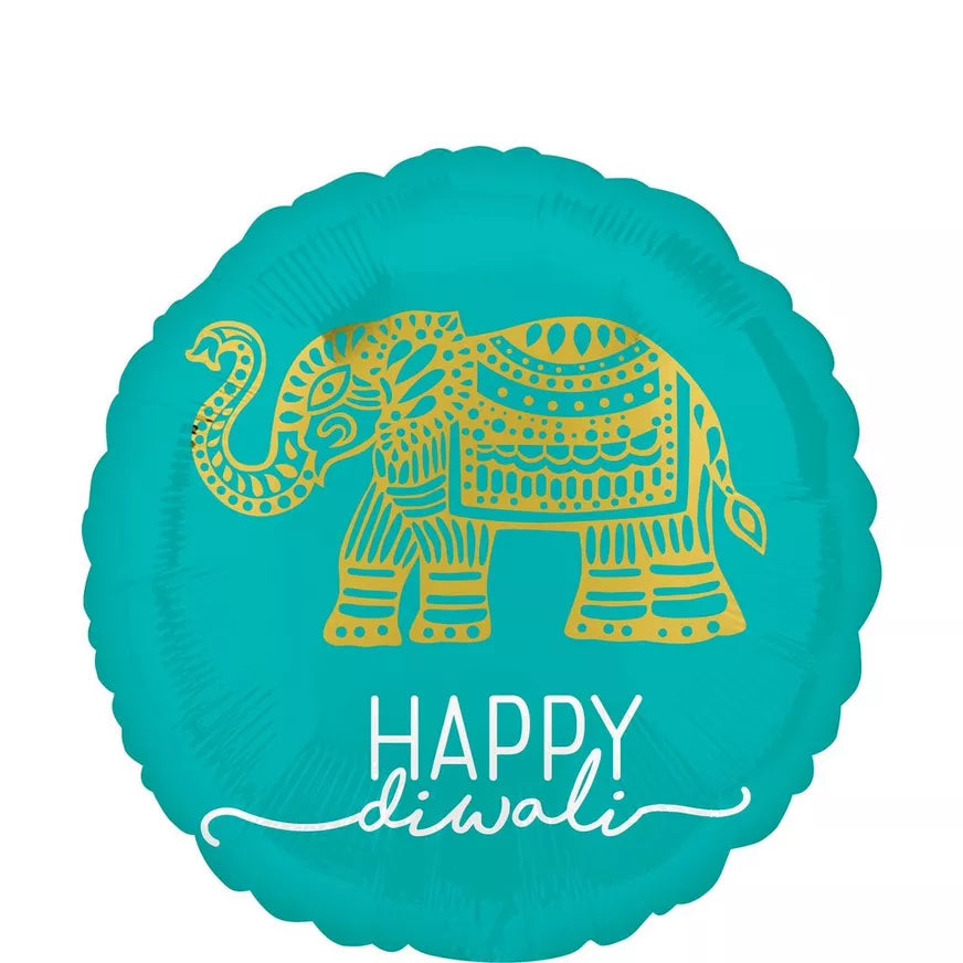 Decorate for your festival of lights celebration with a Diwali Balloon! The round, teal balloon features an elegant metallic gold elephant design in the center above the headline "Happy Diwali." Float a few of these festive balloons around your venue add color to your event space.