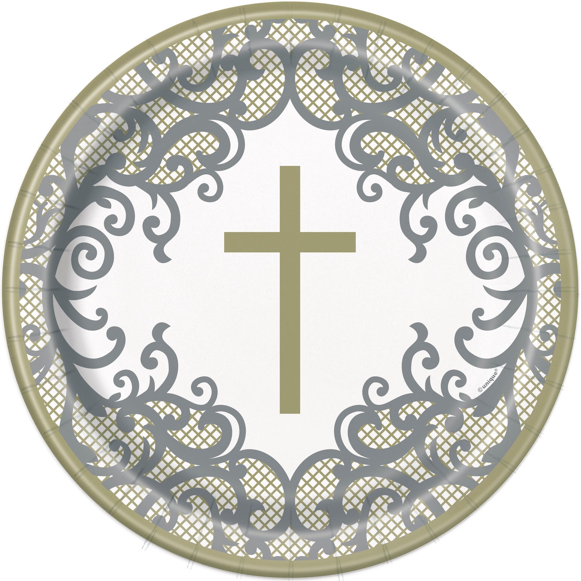 These paper dinner plates feature a gold cross with a fancy gold and silver trim.