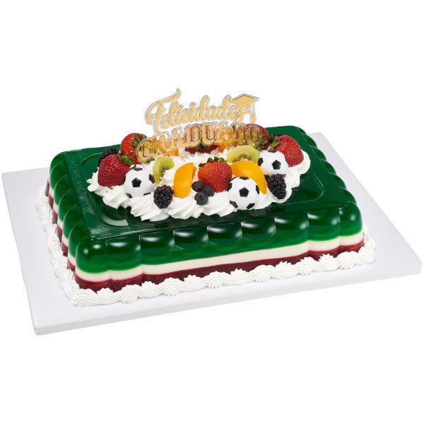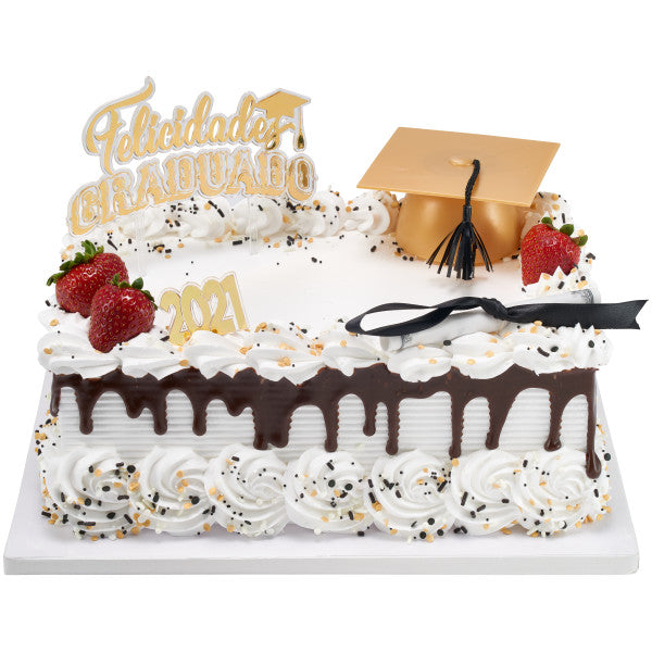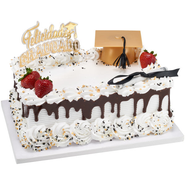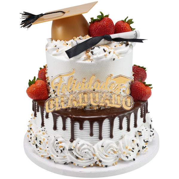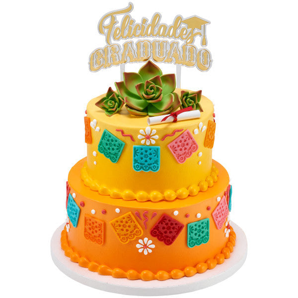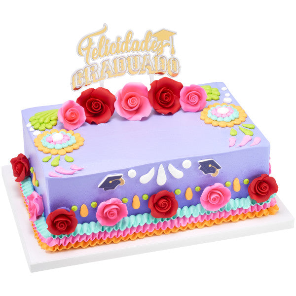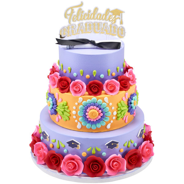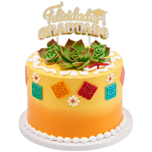 Celebrate the graduados by honoring their rich heritage and paying homage to their roots. This Felicidades Graduado layon is the perfect addition to cakes big or small. Stamped with a gold foil, it's sure to shine atop your design!