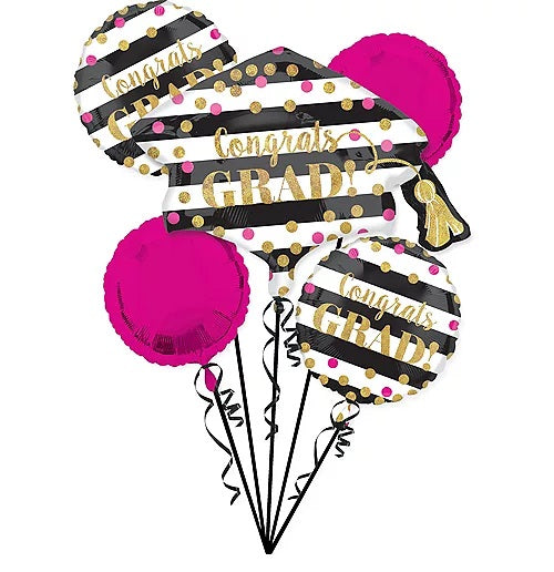 Smiles will shine as bright as your grad with this Giant Prismatic Confetti Graduation Balloon Bouquet with Balloon Weight! This six-piece balloon bouquet features a giant sparkly foil balloon in the shape of a grad cap, with black and white stripes and a "Congrats Grad!" headline. Also included are two smaller round foil balloons with the same design, and two round solid pink balloons. With the attached ribbons and grad cap balloon weight, you can add use this graduation balloon bouquet as a centerpiece or add it to other graduation party decorations.