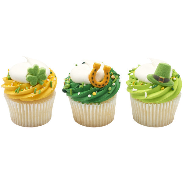 Create a cake worthy of St. Patrick himself with these decorations. Assortment includes green leprechaun hats, gold horseshoes, and green clovers. Made of finely granulated sugar molded into shapes and hand painted with edible food color. Contains no Red 3.