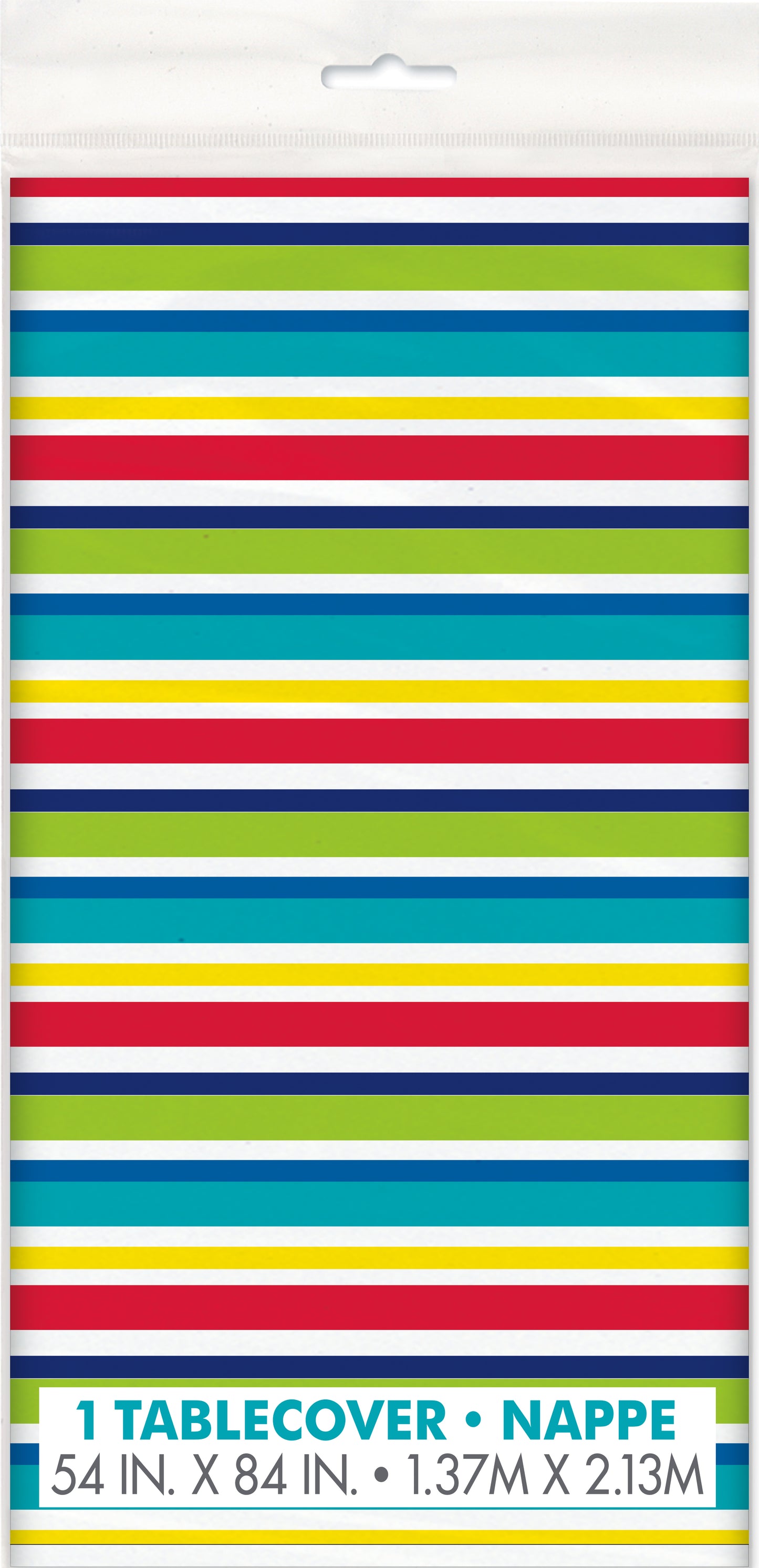 Protects your party table against spills and stains at any birthday party celebration. Disposable table cover makes after-party cleanup a breeze. This plastic table cover features bright multi-colored stripes along both sides with a white stripe in the middle.