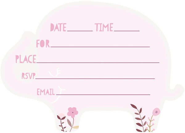 These Pink Floral Elephant Invitations are approximately 6" x 4". They have lines for all the important celebration information: Date, Time, For, Place, RSVP, and Email. 8 invitations and 8 envelopes per package.